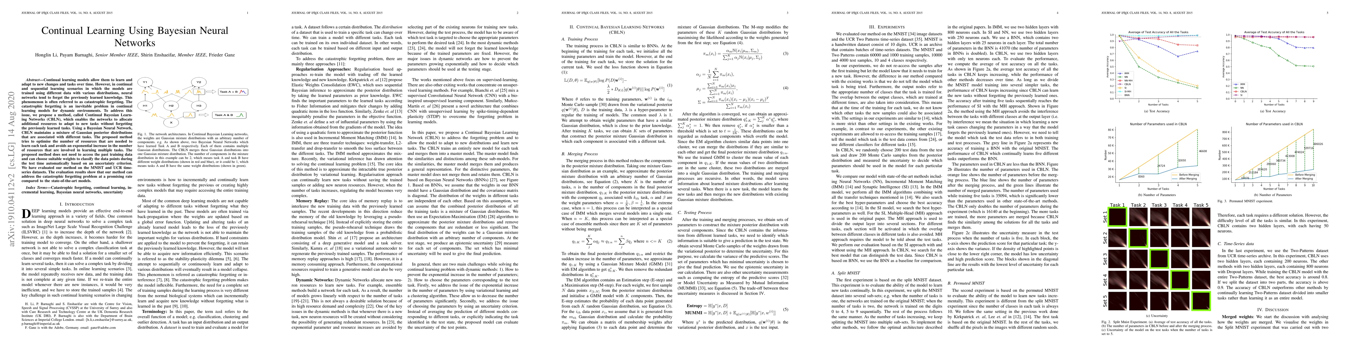 The paper proposes Continual Bayesian Learning Networks (CBLN) to tackle catastrophic forgetting in continual learning scenarios. CBLN uses Bayesian Neural Networks to maintain a mixture of Gaussian posteriors for different tasks, optimizing resource allocation without needing past data, and demonstrates promising results in addressing forgetting on MNIST and UCR datasets.