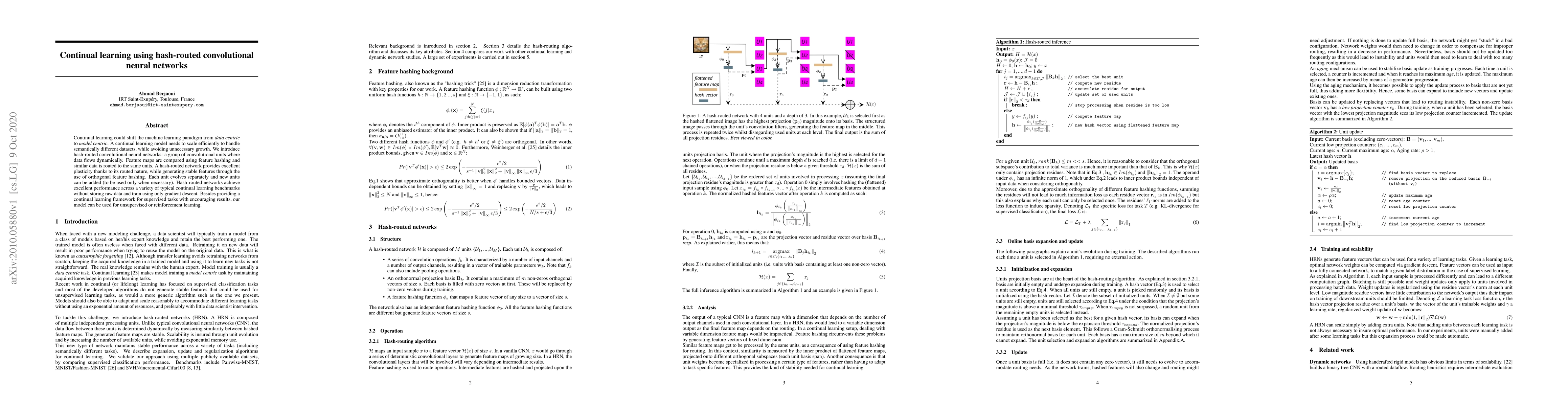 This paper proposes hash-routed convolutional neural networks for efficient continual learning, where data is dynamically routed to appropriate units based on feature hashing, enabling scalability and plasticity while maintaining stable features. The model demonstrates strong performance across continual learning benchmarks without storing raw data.