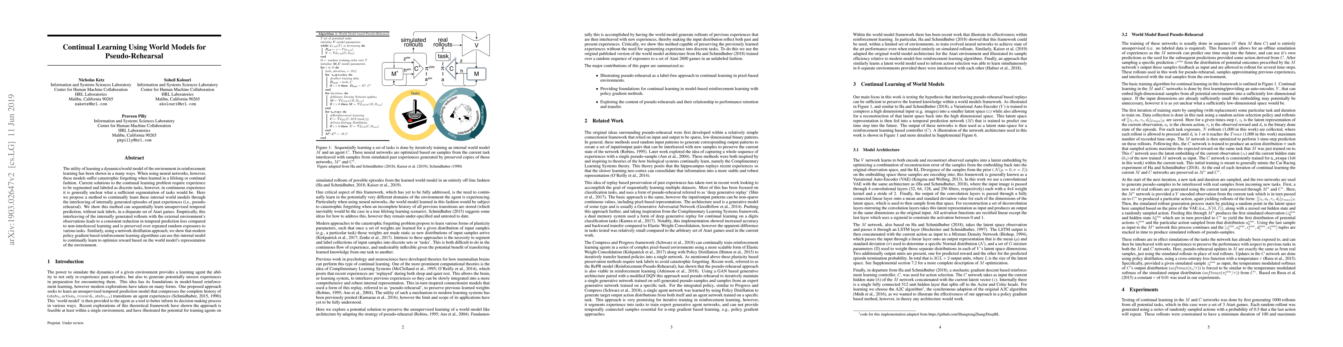 This paper proposes a method using pseudo-rehearsal to continually learn world models in reinforcement learning without catastrophic forgetting, achieving better temporal prediction and reward optimization across various Atari games. The approach interleaves internally generated past experiences with real observations, demonstrating reduced prediction loss and improved performance over time.