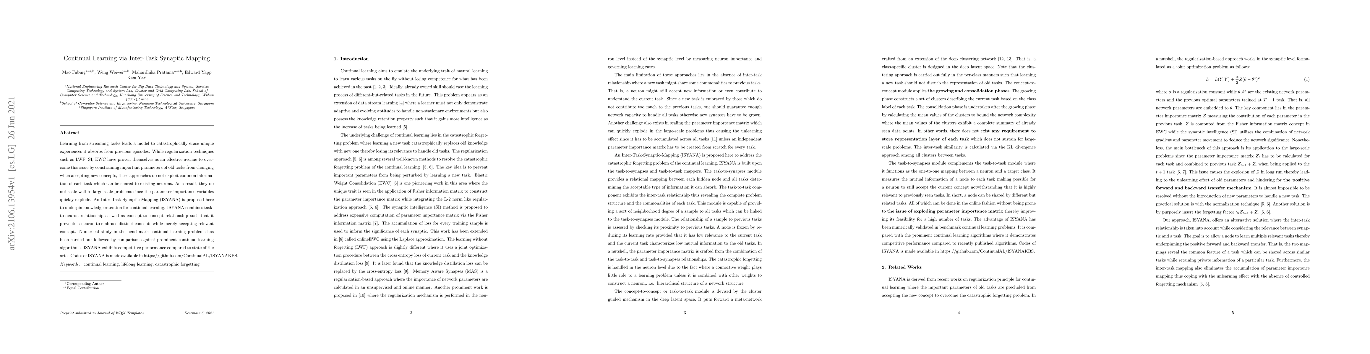 Learning from streaming tasks leads a model to catastrophically erase unique experiences it absorbs from previous episodes. While regularization techniques such as LWF, SI, EWC have proven themselves as an effective avenue to overcome this issue by constraining important parameters of old tasks from changing when accepting new concepts, these approaches do not exploit common information of each task which can be shared to existing neurons. As a result, they do not scale well to large-scale problems since the parameter importance variables quickly explode. An Inter-Task Synaptic Mapping (ISYANA) is proposed here to underpin knowledge retention for continual learning. ISYANA combines task-to-neuron relationship as well as concept-to-concept relationship such that it prevents a neuron to embrace distinct concepts while merely accepting relevant concept. Numerical study in the benchmark continual learning problems has been carried out followed by comparison against prominent continual learning algorithms. ISYANA exhibits competitive performance compared to state of the arts. Codes of ISYANA is made available in \url{https://github.com/ContinualAL/ISYANAKBS}.