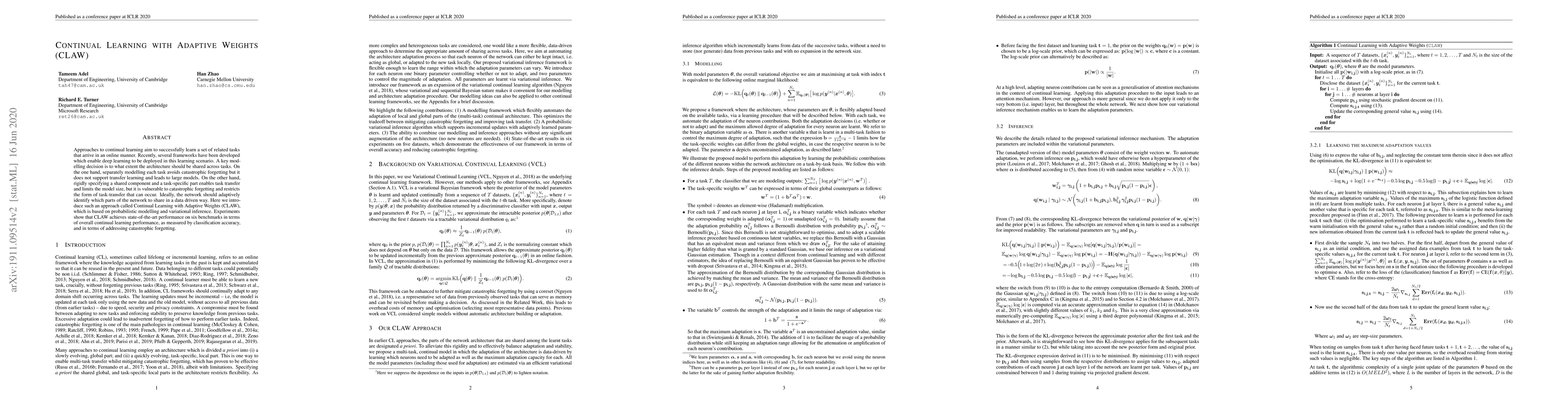 Approaches to continual learning aim to successfully learn a set of related tasks that arrive in an online manner. Recently, several frameworks have been developed which enable deep learning to be deployed in this learning scenario. A key modelling decision is to what extent the architecture should be shared across tasks. On the one hand, separately modelling each task avoids catastrophic forgetting but it does not support transfer learning and leads to large models. On the other hand, rigidly specifying a shared component and a task-specific part enables task transfer and limits the model size, but it is vulnerable to catastrophic forgetting and restricts the form of task-transfer that can occur. Ideally, the network should adaptively identify which parts of the network to share in a data driven way. Here we introduce such an approach called Continual Learning with Adaptive Weights (CLAW), which is based on probabilistic modelling and variational inference. Experiments show that CLAW achieves state-of-the-art performance on six benchmarks in terms of overall continual learning performance, as measured by classification accuracy, and in terms of addressing catastrophic forgetting.