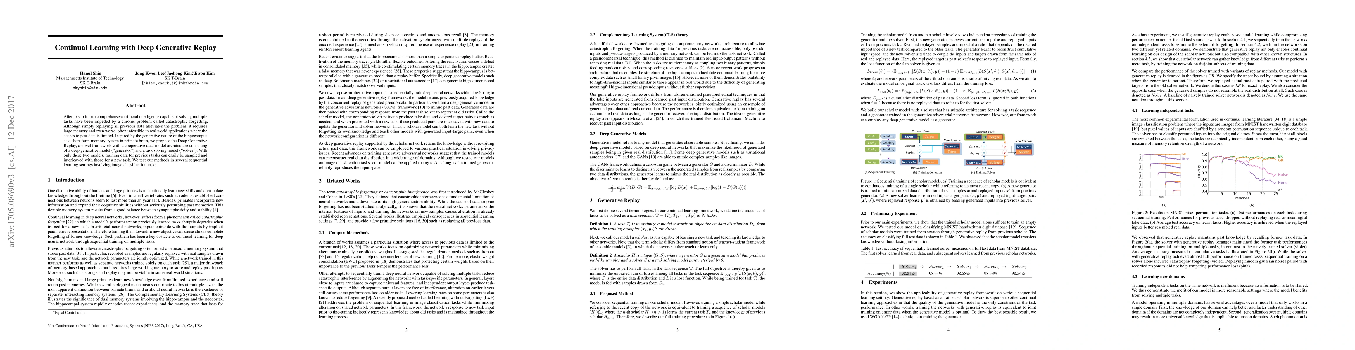 This paper proposes Deep Generative Replay to address catastrophic forgetting in continual learning by using a generative model to sample training data from previous tasks, thus avoiding the need for large memory storage of past data. The framework employs a dual model architecture with a generative "generator" and a task-solving "solver" to interleave training data for new tasks with sampled data from previous tasks, tested in image classification tasks.