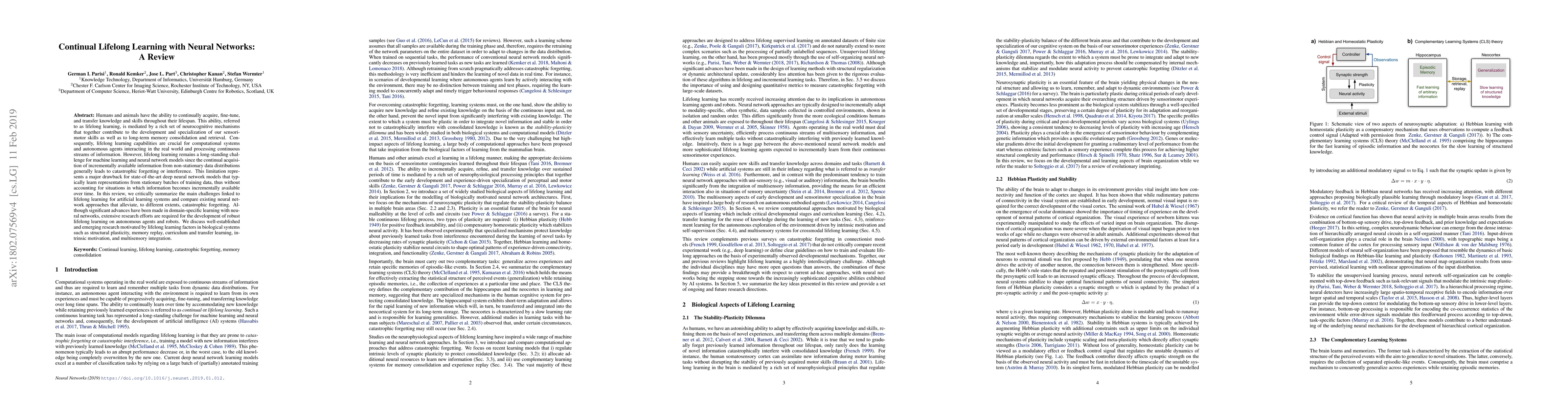 Humans and animals have the ability to continually acquire, fine-tune, and transfer knowledge and skills throughout their lifespan. This ability, referred to as lifelong learning, is mediated by a rich set of neurocognitive mechanisms that together contribute to the development and specialization of our sensorimotor skills as well as to long-term memory consolidation and retrieval. Consequently, lifelong learning capabilities are crucial for autonomous agents interacting in the real world and processing continuous streams of information. However, lifelong learning remains a long-standing challenge for machine learning and neural network models since the continual acquisition of incrementally available information from non-stationary data distributions generally leads to catastrophic forgetting or interference. This limitation represents a major drawback for state-of-the-art deep neural network models that typically learn representations from stationary batches of training data, thus without accounting for situations in which information becomes incrementally available over time. In this review, we critically summarize the main challenges linked to lifelong learning for artificial learning systems and compare existing neural network approaches that alleviate, to different extents, catastrophic forgetting. We discuss well-established and emerging research motivated by lifelong learning factors in biological systems such as structural plasticity, memory replay, curriculum and transfer learning, intrinsic motivation, and multisensory integration.