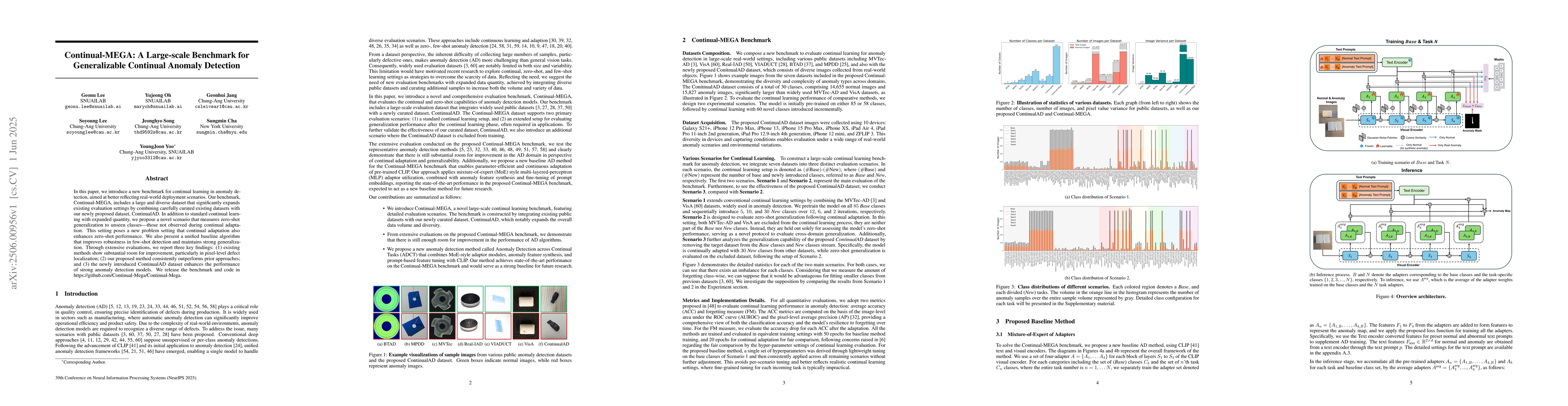 In this paper, we introduce a new benchmark for continual learning in anomaly detection, aimed at better reflecting real-world deployment scenarios. Our benchmark, Continual-MEGA, includes a large and diverse dataset that significantly expands existing evaluation settings by combining carefully curated existing datasets with our newly proposed dataset, ContinualAD. In addition to standard continual learning with expanded quantity, we propose a novel scenario that measures zero-shot generalization to unseen classes, those not observed during continual adaptation. This setting poses a new problem setting that continual adaptation also enhances zero-shot performance. We also present a unified baseline algorithm that improves robustness in few-shot detection and maintains strong generalization. Through extensive evaluations, we report three key findings: (1) existing methods show substantial room for improvement, particularly in pixel-level defect localization; (2) our proposed method consistently outperforms prior approaches; and (3) the newly introduced ContinualAD dataset enhances the performance of strong anomaly detection models. We release the benchmark and code in https://github.com/Continual-Mega/Continual-Mega.