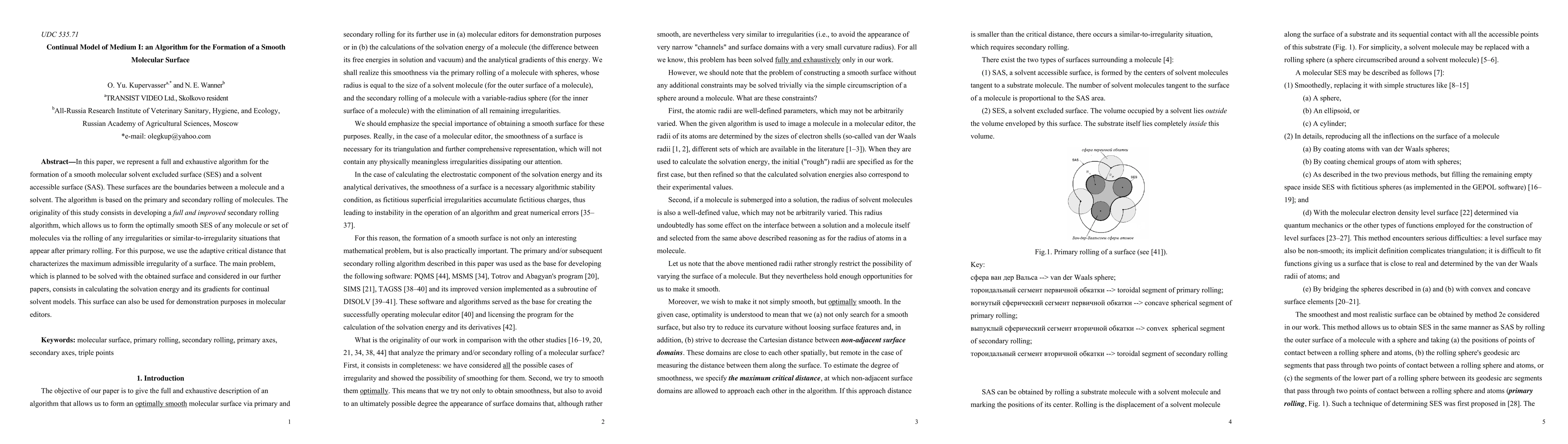 The paper presents a comprehensive algorithm for forming a smooth molecular Solvent Excluded Surface (SES) and Solvent Accessible Surface (SAS) using primary and secondary rolling of molecules. The algorithm includes detailed descriptions of primary rolling sphere centers, radii, local bases, and angles, as well as secondary rolling tori parameters.
