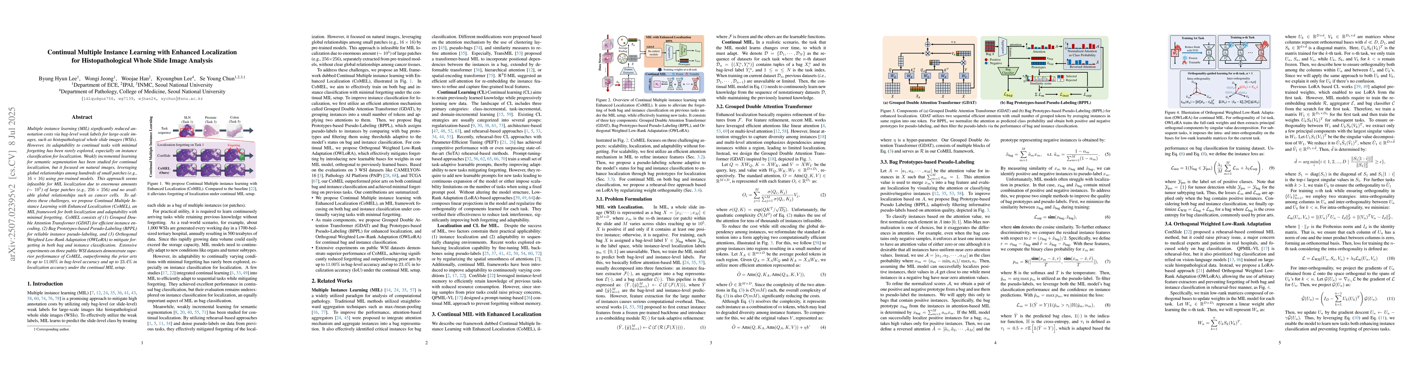 Multiple instance learning (MIL) significantly reduced annotation costs via bag-level weak labels for large-scale images, such as histopathological whole slide images (WSIs). However, its adaptability to continual tasks with minimal forgetting has been rarely explored, especially on instance classification for localization. Weakly incremental learning for semantic segmentation has been studied for continual localization, but it focused on natural images, leveraging global relationships among hundreds of small patches (e.g., $16 \times 16$) using pre-trained models. This approach seems infeasible for MIL localization due to enormous amounts ($\sim 10^5$) of large patches (e.g., $256 \times 256$) and no available global relationships such as cancer cells. To address these challenges, we propose Continual Multiple Instance Learning with Enhanced Localization (CoMEL), an MIL framework for both localization and adaptability with minimal forgetting. CoMEL consists of (1) Grouped Double Attention Transformer (GDAT) for efficient instance encoding, (2) Bag Prototypes-based Pseudo-Labeling (BPPL) for reliable instance pseudo-labeling, and (3) Orthogonal Weighted Low-Rank Adaptation (OWLoRA) to mitigate forgetting in both bag and instance classification. Extensive experiments on three public WSI datasets demonstrate superior performance of CoMEL, outperforming the prior arts by up to $11.00\%$ in bag-level accuracy and up to $23.4\%$ in localization accuracy under the continual MIL setup.