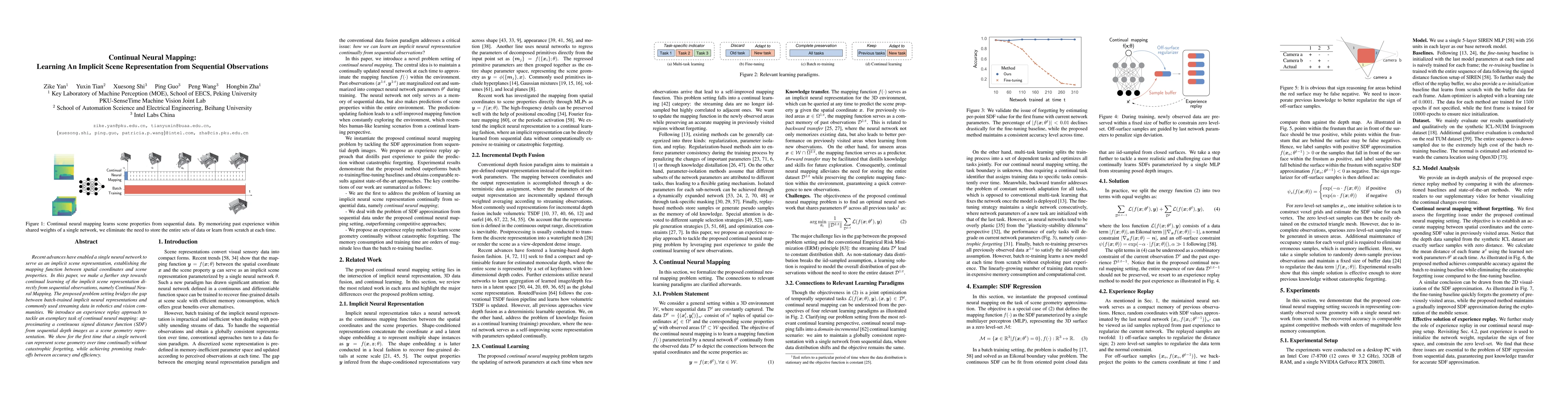 This paper proposes Continual Neural Mapping, a method for learning an implicit scene representation from sequential observations using an experience replay approach. It demonstrates that a single neural network can continually update its representation of scene geometry, approximated by a signed distance function, without catastrophic forgetting, bridging batch-trained implicit representations with streaming data.