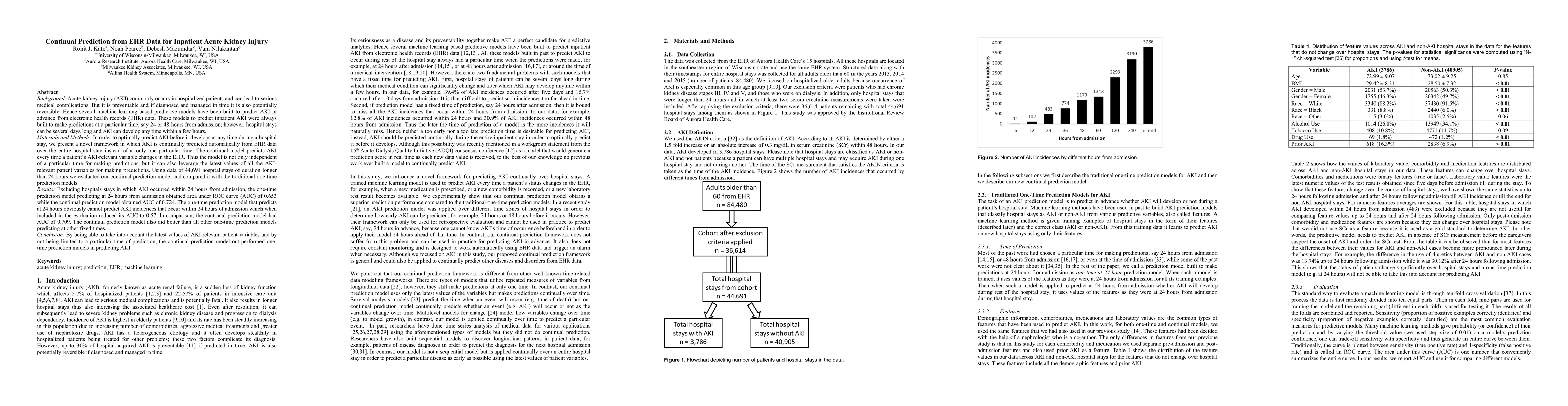 This paper introduces a continual prediction framework for inpatient acute kidney injury (AKI) using electronic health record (EHR) data, which predicts AKI at any time during a hospital stay based on the latest patient variables. The continual model outperformed traditional one-time prediction models, achieving an AUC of 0.724 compared to 0.653 for the best one-time model at 24 hours, demonstrating its advantage in capturing AKI incidents occurring at any time during the hospital stay.