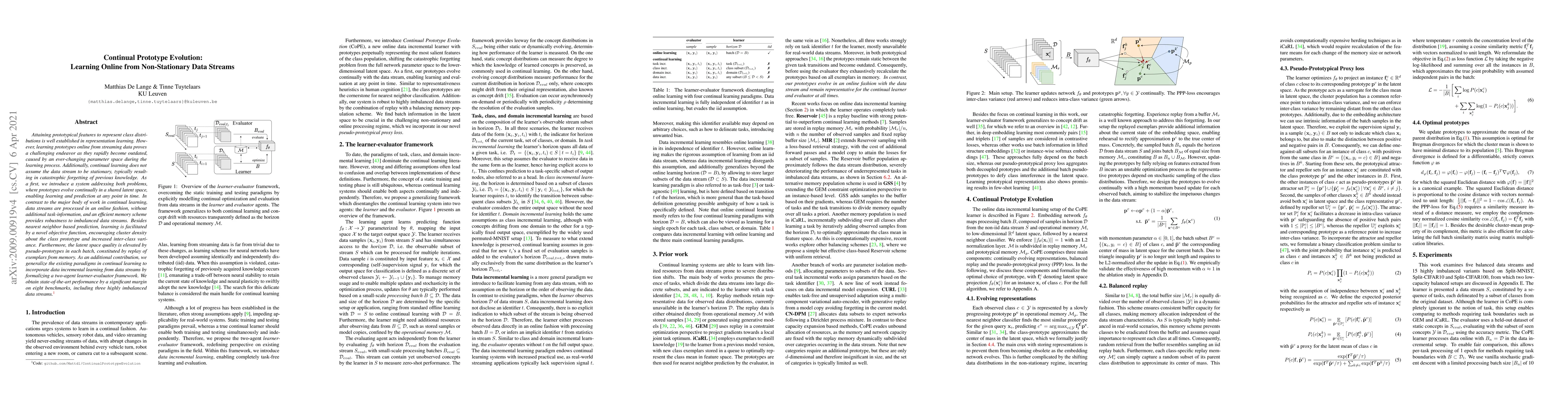 Attaining prototypical features to represent class distributions is well established in representation learning. However, learning prototypes online from streaming data proves a challenging endeavor as they rapidly become outdated, caused by an ever-changing parameter space during the learning process. Additionally, continual learning does not assume the data stream to be stationary, typically resulting in catastrophic forgetting of previous knowledge. As a first, we introduce a system addressing both problems, where prototypes evolve continually in a shared latent space, enabling learning and prediction at any point in time. In contrast to the major body of work in continual learning, data streams are processed in an online fashion, without additional task-information, and an efficient memory scheme provides robustness to imbalanced data streams. Besides nearest neighbor based prediction, learning is facilitated by a novel objective function, encouraging cluster density about the class prototype and increased inter-class variance. Furthermore, the latent space quality is elevated by pseudo-prototypes in each batch, constituted by replay of exemplars from memory. As an additional contribution, we generalize the existing paradigms in continual learning to incorporate data incremental learning from data streams by formalizing a two-agent learner-evaluator framework. We obtain state-of-the-art performance by a significant margin on eight benchmarks, including three highly imbalanced data streams.