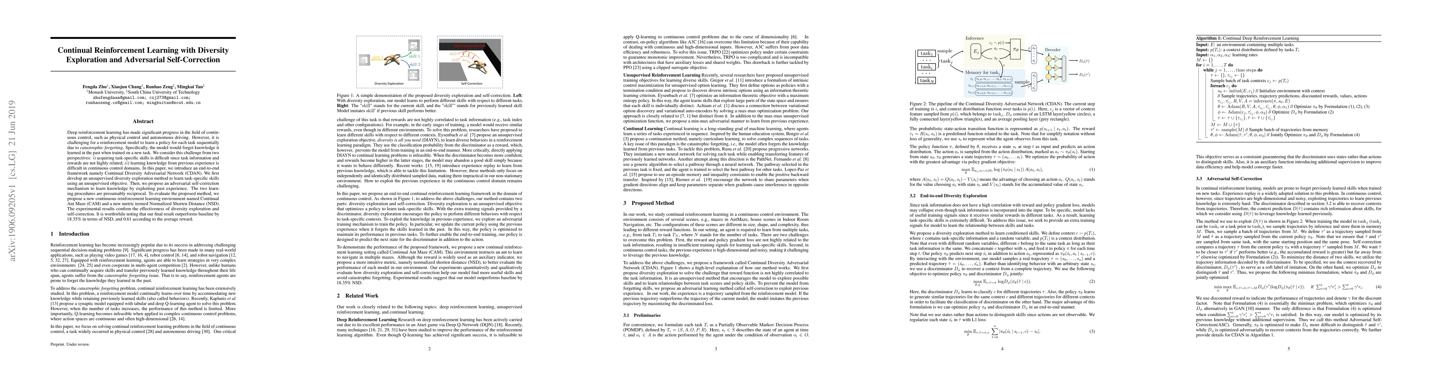 This paper introduces the Continual Diversity Adversarial Network (CDAN) to address catastrophic forgetting in continual reinforcement learning. It combines diversity exploration and adversarial self-correction to learn task-specific skills and leverage past experiences, evaluated in a new environment called Continual Ant Maze, showing a 18.35% improvement in Normalized Shorten Distance and a 0.61 average reward gain over baselines.