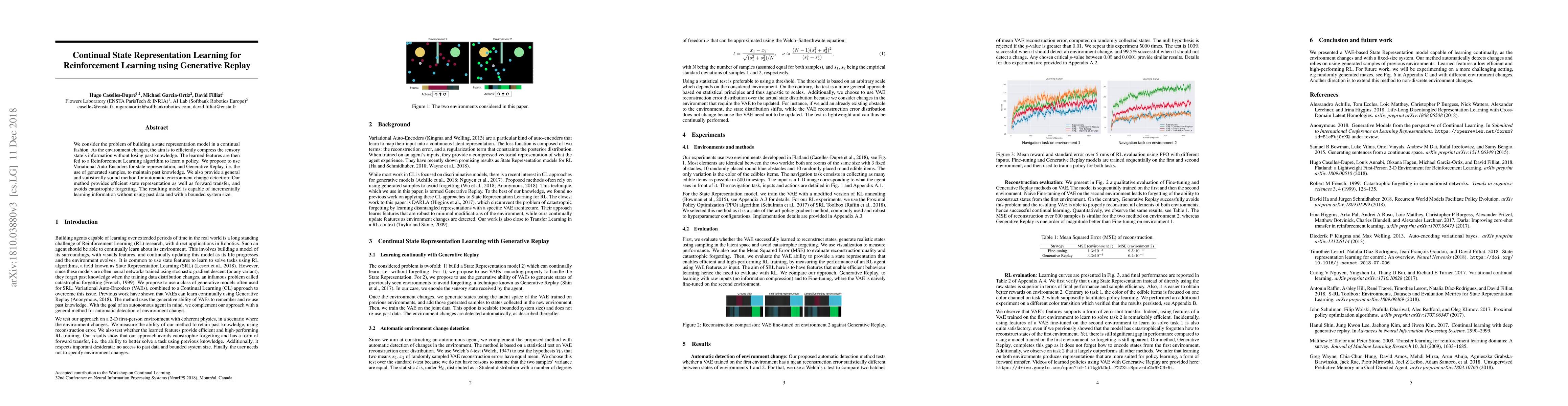 This paper proposes a method for continual state representation learning using Variational Auto-Encoders and Generative Replay to efficiently compress sensory information while retaining past knowledge. The approach includes a statistically sound method for detecting environment changes and avoids catastrophic forgetting, enabling incremental learning without using past data.