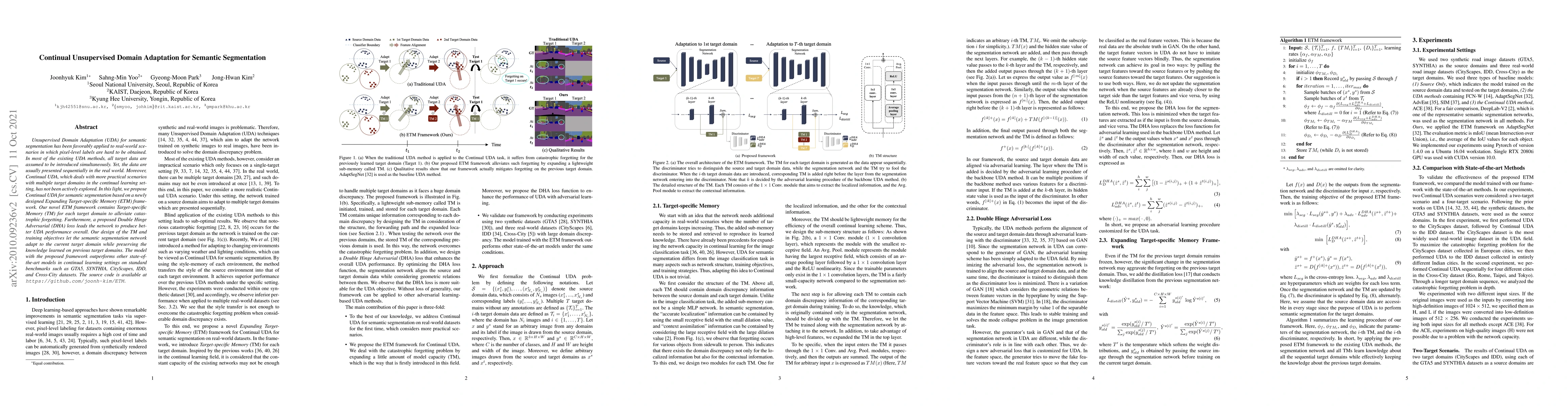 This paper proposes a Continual Unsupervised Domain Adaptation (UDA) framework for semantic segmentation that utilizes an Expanding Target-specific Memory (ETM) to mitigate catastrophic forgetting while adapting to new target domains sequentially. The Double Hinge Adversarial (DHA) loss enhances overall UDA performance, leading to superior results compared to state-of-the-art models in continual learning scenarios.
