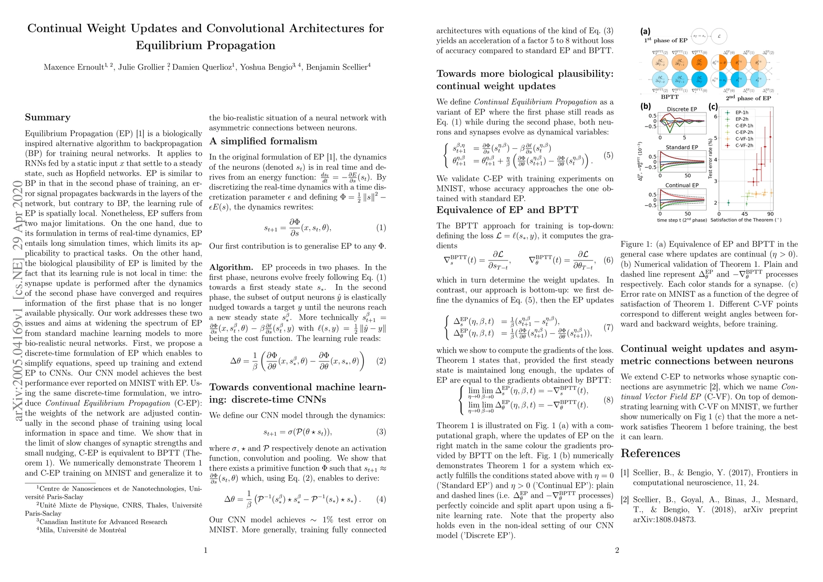 This paper explores Equilibrium Propagation (EP), a biologically inspired alternative to backpropagation for training neural networks, particularly focusing on Recurrent Neural Networks (RNNs) and Convolutional Neural Networks (CNNs). The authors propose a discrete-time formulation of EP to speed up training and extend its applicability, introducing Continual Equilibrium Propagation (C-EP) that adjusts weights continually during training. They demonstrate C-EP's effectiveness and equivalence to backpropagation through small nudging, achieving state-of-the-art performance on the MNIST dataset.