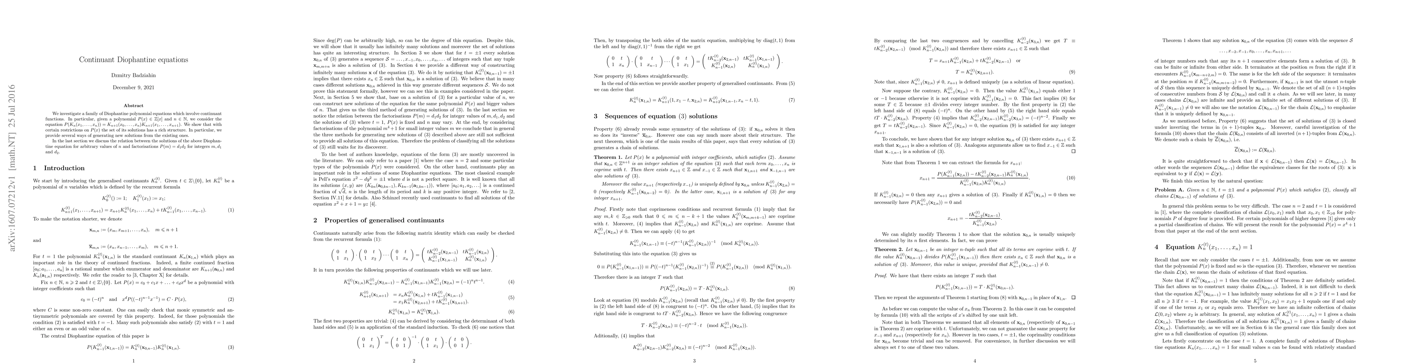 This paper explores Diophantine equations involving continuant functions, demonstrating that under specific restrictions on polynomial $P(x)$, the solution set exhibits a rich structure. The authors also present methods for generating new solutions from existing ones and discuss the connection between the solutions and factorizations of $P(m) = d_1d_2$ for integers.