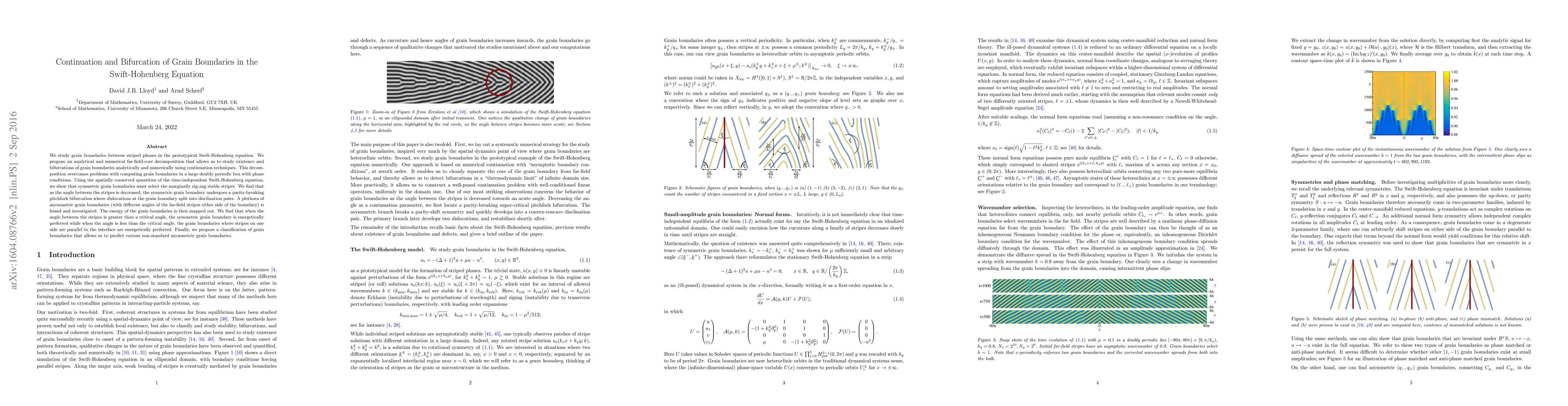 This paper investigates the continuation and bifurcation of grain boundaries in the Swift-Hohenberg equation, proposing a far-field-core decomposition method to analyze these phenomena. It finds that symmetric grain boundaries undergo a pitchfork bifurcation, leading to the formation of disclination pairs, and classifies asymmetric grain boundaries based on energy preferences.