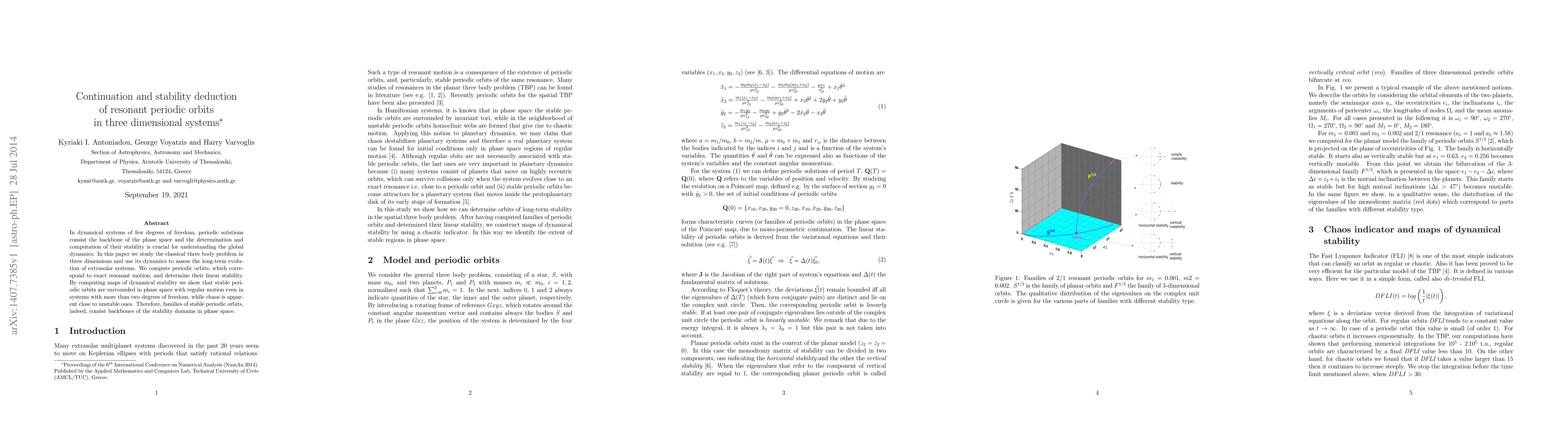 This paper investigates the continuation and stability of resonant periodic orbits in three-dimensional dynamical systems, focusing on the three-body problem. It finds that stable periodic orbits form stable domains in phase space, while chaos emerges near unstable orbits, highlighting their importance in understanding global dynamics.