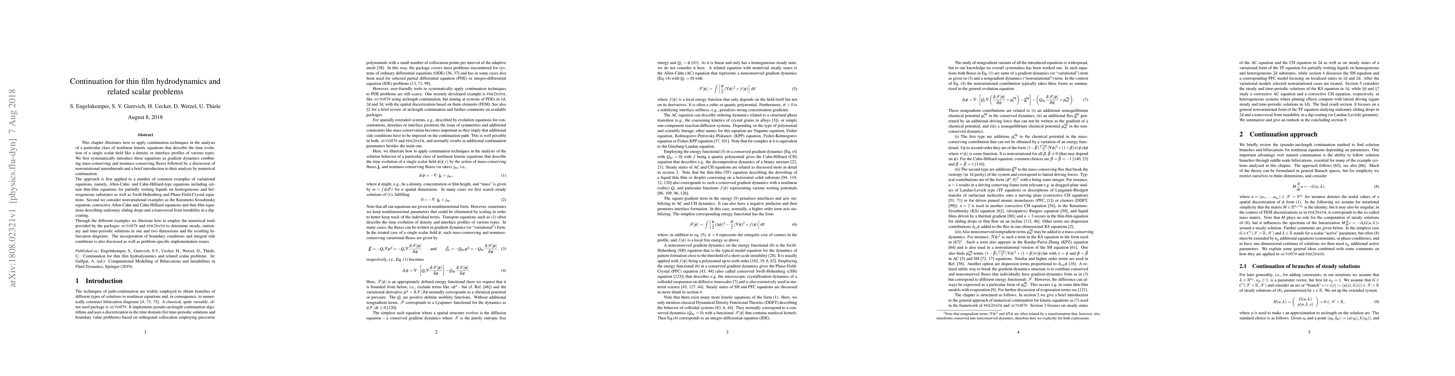 This chapter illustrates how to apply continuation techniques in the analysis of a particular class of nonlinear kinetic equations that describe the time evolution through transport equations for a single scalar field like a densities or interface profiles of various types. We first systematically introduce these equations as gradient dynamics combining mass-conserving and nonmass-conserving fluxes followed by a discussion of nonvariational amendmends and a brief introduction to their analysis by numerical continuation. The approach is first applied to a number of common examples of variational equations, namely, Allen-Cahn- and Cahn-Hilliard-type equations including certain thin-film equations for partially wetting liquids on homogeneous and heterogeneous substrates as well as Swift-Hohenberg and Phase-Field-Crystal equations. Second we consider nonvariational examples as the Kuramoto-Sivashinsky equation, convective Allen-Cahn and Cahn-Hilliard equations and thin-film equations describing stationary sliding drops and a transversal front instability in a dip-coating. Through the different examples we illustrate how to employ the numerical tools provided by the packages auto07p and pde2path to determine steady, stationary and time-periodic solutions in one and two dimensions and the resulting bifurcation diagrams. The incorporation of boundary conditions and integral side conditions is also discussed as well as problem-specific implementation issues.