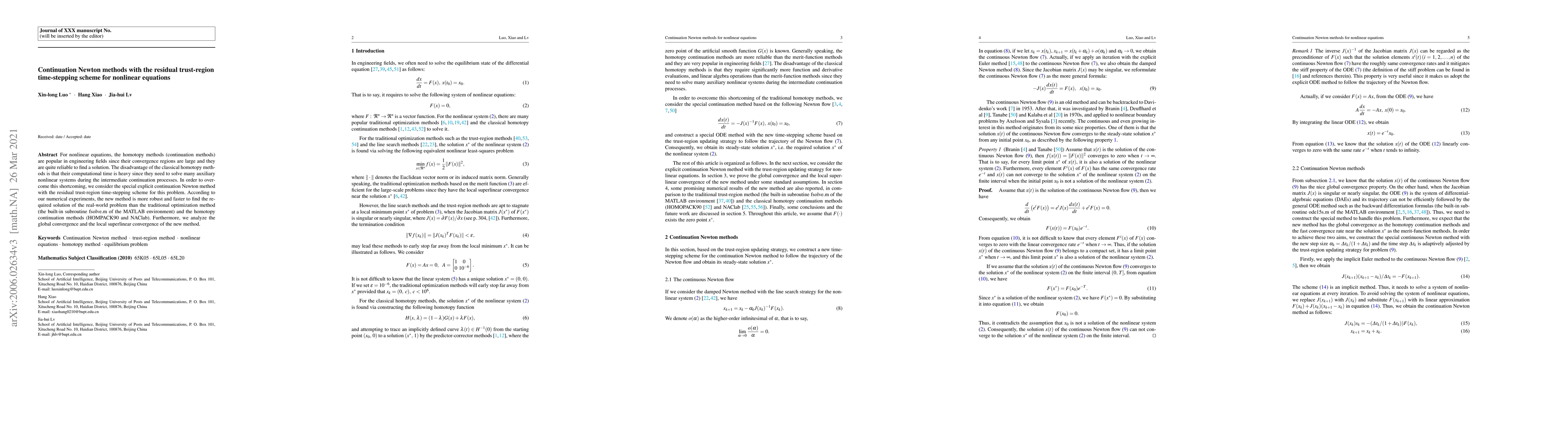 This paper proposes a continuation Newton method with a residual trust-region time-stepping scheme for solving nonlinear equations, which is more robust and faster than traditional methods like fsolve.m, HOMPACK90, and NAClab. The method demonstrates both global and local superlinear convergence.