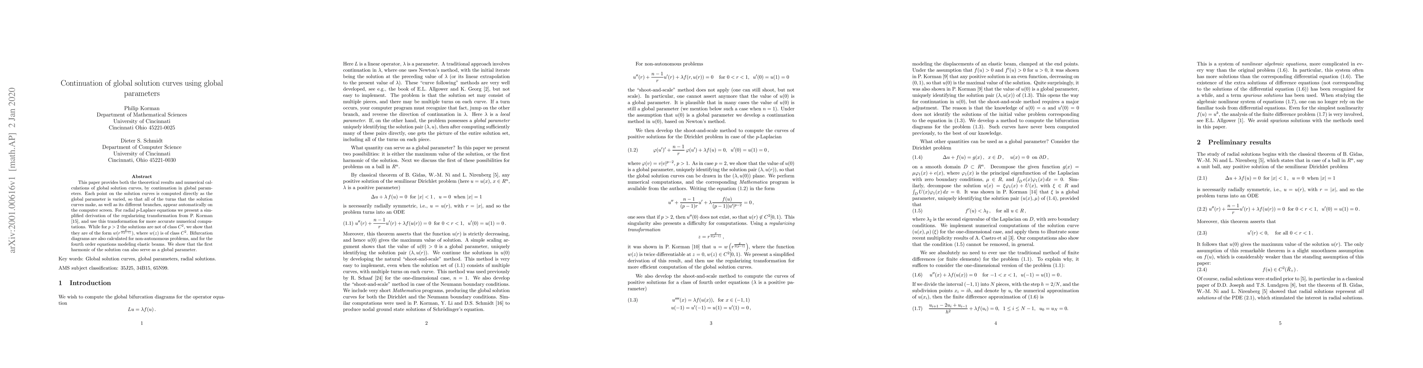 This paper provides both the theoretical results and numerical calculations of global solution curves, by continuation in global parameters. Each point on the solution curves is computed directly as the global parameter is varied, so that all of the turns that the solution curves make, as well as its different branches, appear automatically on the computer screen. For radial $p$-Laplace equations we present a simplified derivation of the regularizing transformation from P. Korman [15], and use this transformation for more accurate numerical computations. While for $p>2$ the solutions are not of class $C^2$, we show that they are of the form $w(r^{\frac{p}{2(p-1)}})$, where $w(z)$ is of class $C^2$. Bifurcation diagrams are also calculated for non-autonomous problems, and for the fourth order equations modeling elastic beams. We show that the first harmonic of the solution can also serve as a global parameter.