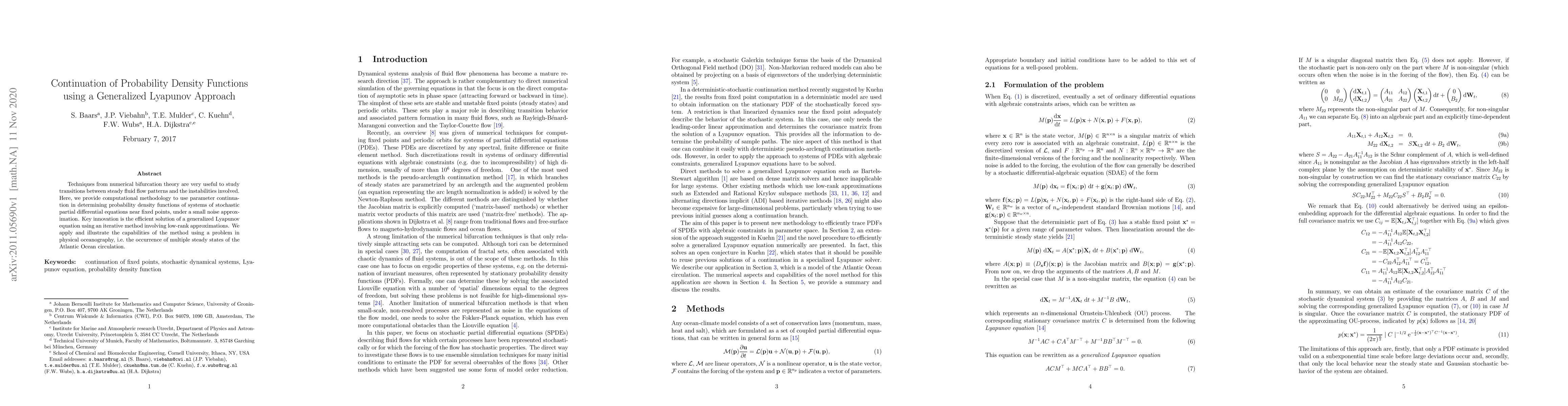 Techniques from numerical bifurcation theory are very useful to study transitions between steady fluid flow patterns and the instabilities involved. Here, we provide computational methodology to use parameter continuation in determining probability density functions of systems of stochastic partial differential equations near fixed points, under a small noise approximation. Key innovation is the efficient solution of a generalized Lyapunov equation using an iterative method involving low-rank approximations. We apply and illustrate the capabilities of the method using a problem in physical oceanography, i.e. the occurrence of multiple steady states of the Atlantic Ocean circulation.