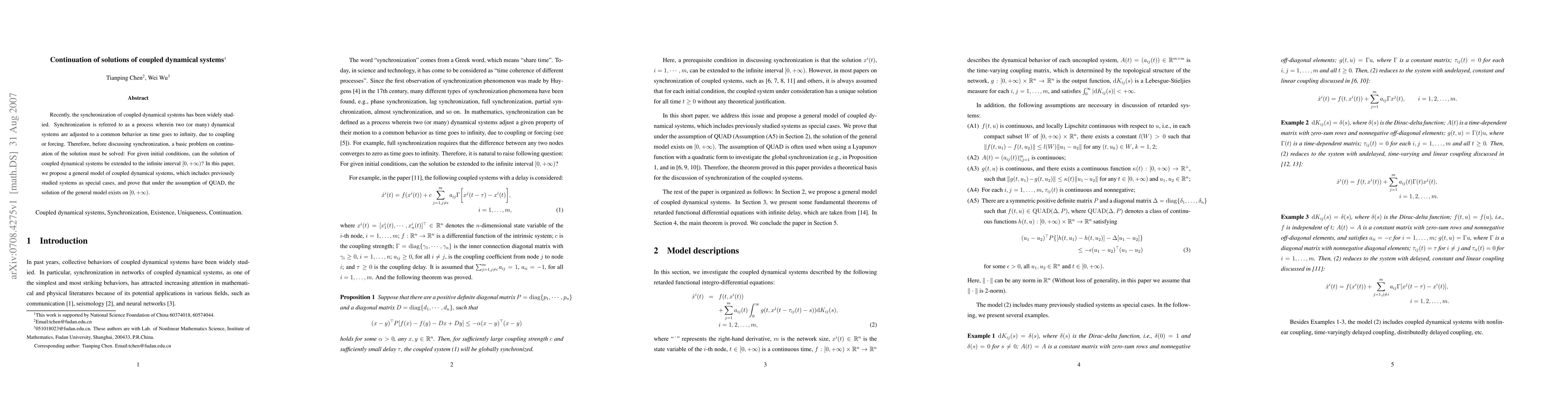 Recently, the synchronization of coupled dynamical systems has been widely studied. Synchronization is referred to as a process wherein two (or many) dynamical systems are adjusted to a common behavior as time goes to infinity, due to coupling or forcing. Therefore, before discussing synchronization, a basic problem on continuation of the solution must be solved: For given initial conditions, can the solution of coupled dynamical systems be extended to the infinite interval $[0,+\infty)$? In this paper, we propose a general model of coupled dynamical systems, which includes previously studied systems as special cases, and prove that under the assumption of QUAD, the solution of the general model exists on $[0,+\infty)$.