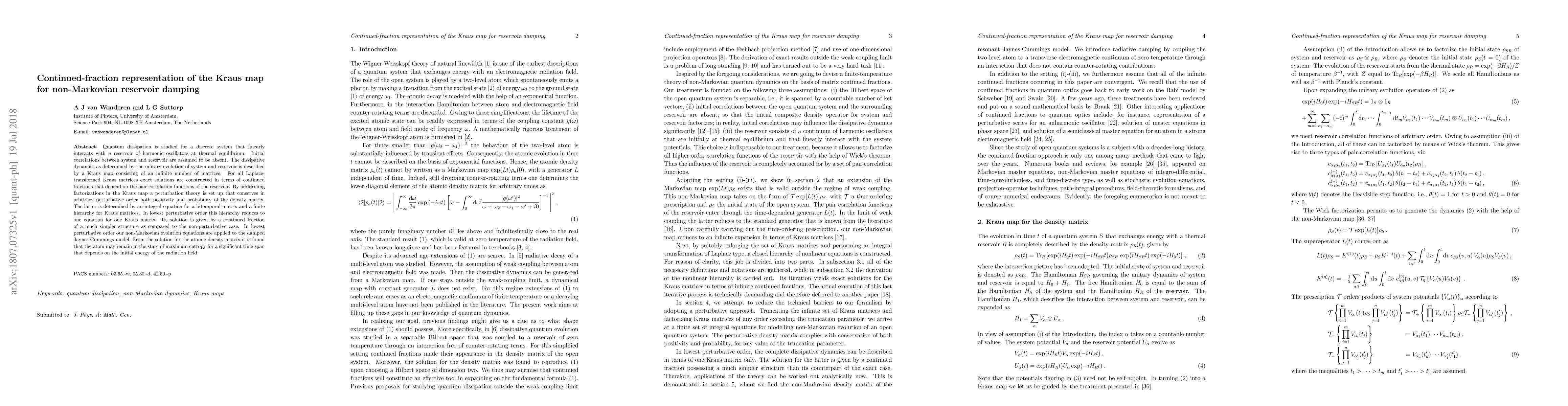 Quantum dissipation is studied for a discrete system that linearly interacts with a reservoir of harmonic oscillators at thermal equilibrium. Initial correlations between system and reservoir are assumed to be absent. The dissipative dynamics as determined by the unitary evolution of system and reservoir is described by a Kraus map consisting of an infinite number of matrices. For all Laplace-transformed Kraus matrices exact solutions are constructed in terms of continued fractions that depend on the pair correlation functions of the reservoir. By performing factorizations in the Kraus map a perturbation theory is set up that conserves in arbitrary perturbative order both positivity and probability of the density matrix. The latter is determined by an integral equation for a bitemporal matrix and a finite hierarchy for Kraus matrices. In lowest perturbative order this hierarchy reduces to one equation for one Kraus matrix. Its solution is given by a continued fraction of a much simpler structure as compared to the non-perturbative case. In lowest perturbative order our non-Markovian evolution equations are applied to the damped Jaynes-Cummings model. From the solution for the atomic density matrix it is found that the atom may remain in the state of maximum entropy for a significant time span that depends on the initial energy of the radiation field.