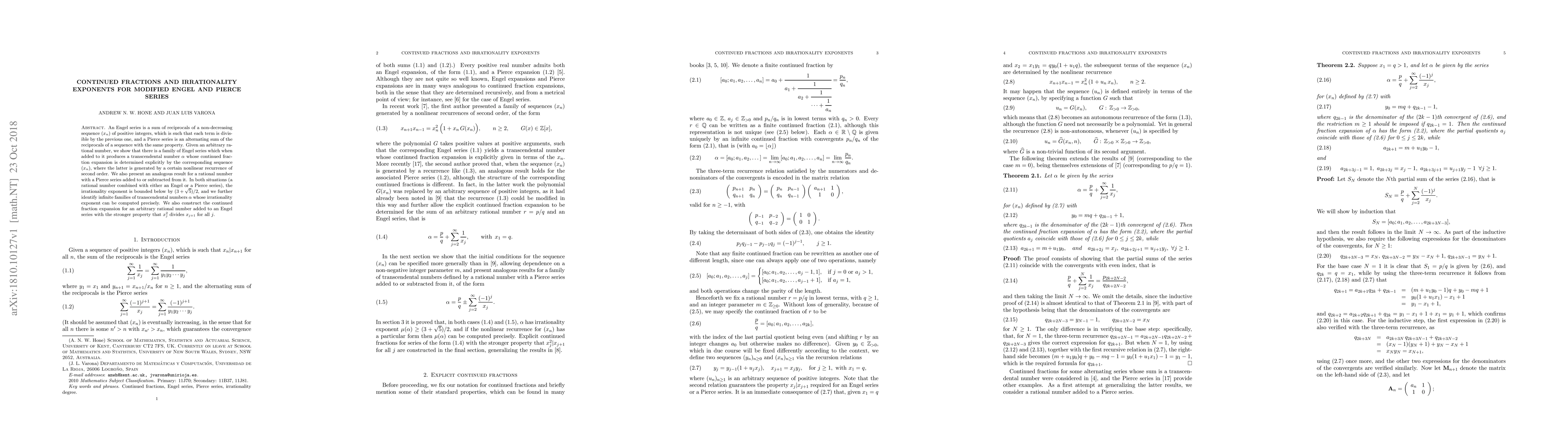 This paper investigates modified Engel and Pierce series, demonstrating that adding these series to rational numbers results in transcendental numbers with specified continued fraction expansions and irrationality exponents bounded below by $(3+\sqrt{5})/2$. It also constructs continued fractions for Engel series where $x_j^2$ divides $x_{j+1}$.