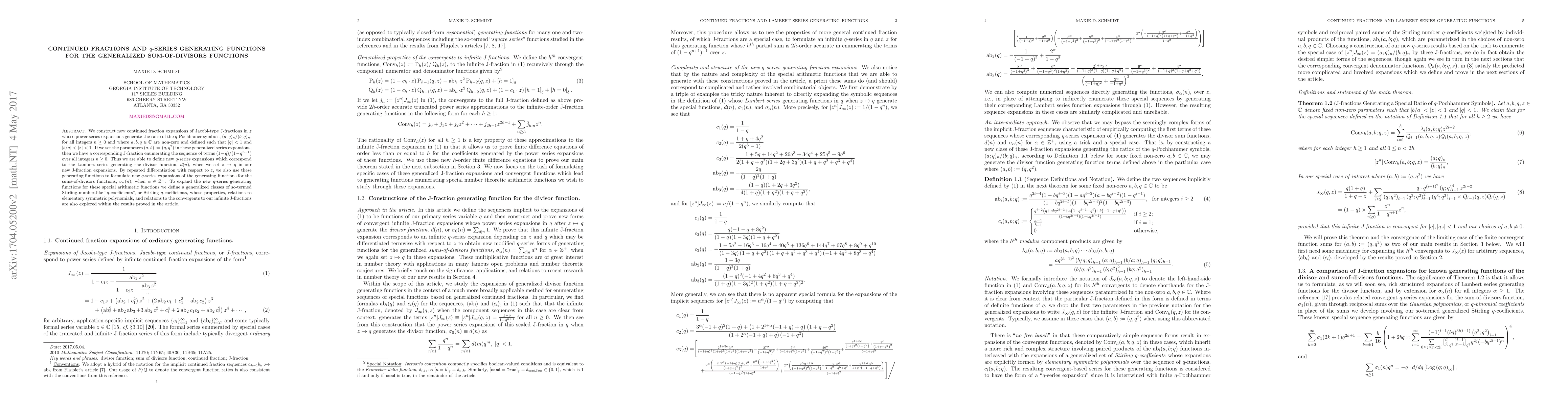 This paper constructs new Jacobi-type J-fraction expansions generating $q$-series ratios and defines $q$-series for the generalized sum-of-divisors functions $\sigma_{\alpha}(n)$. It introduces Stirling $q$-coefficients to explore properties and relations to elementary symmetric polynomials and convergents.