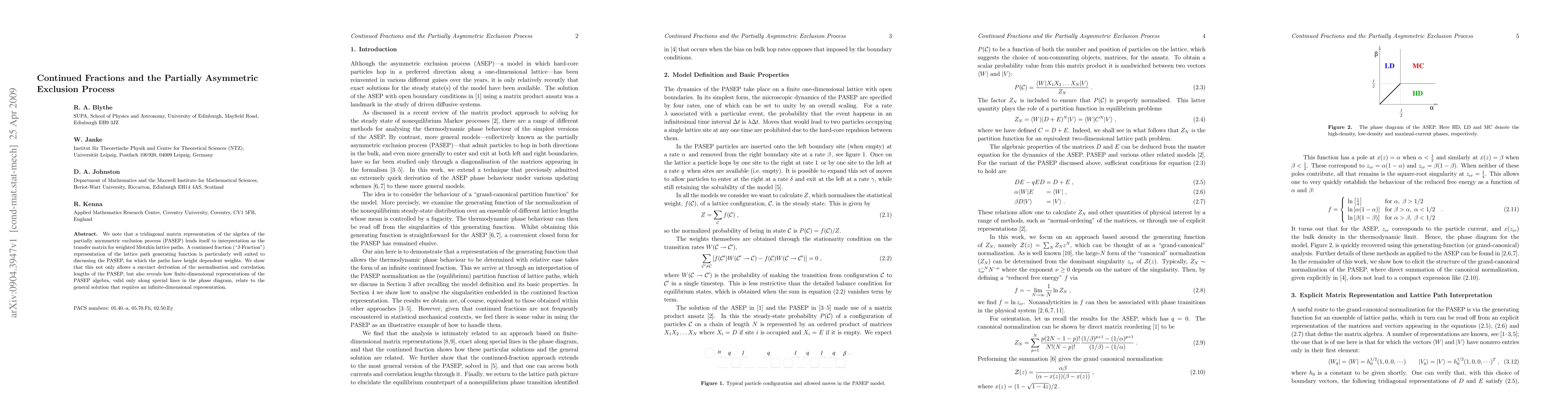 We note that a tridiagonal matrix representation of the algebra of the partially asymmetric exclusion process (PASEP) lends itself to interpretation as the transfer matrix for weighted Motzkin lattice paths. A continued fraction ("J-Fraction") representation of the lattice path generating function is particularly well suited to discussing the PASEP, for which the paths have height dependent weights. We show that this not only allows a succinct derivation of the normalisation and correlation lengths of the PASEP, but also reveals how finite-dimensional representations of the PASEP algebra, valid only along special lines in the phase diagram, relate to the general solution that requires an infinite-dimensional representation.