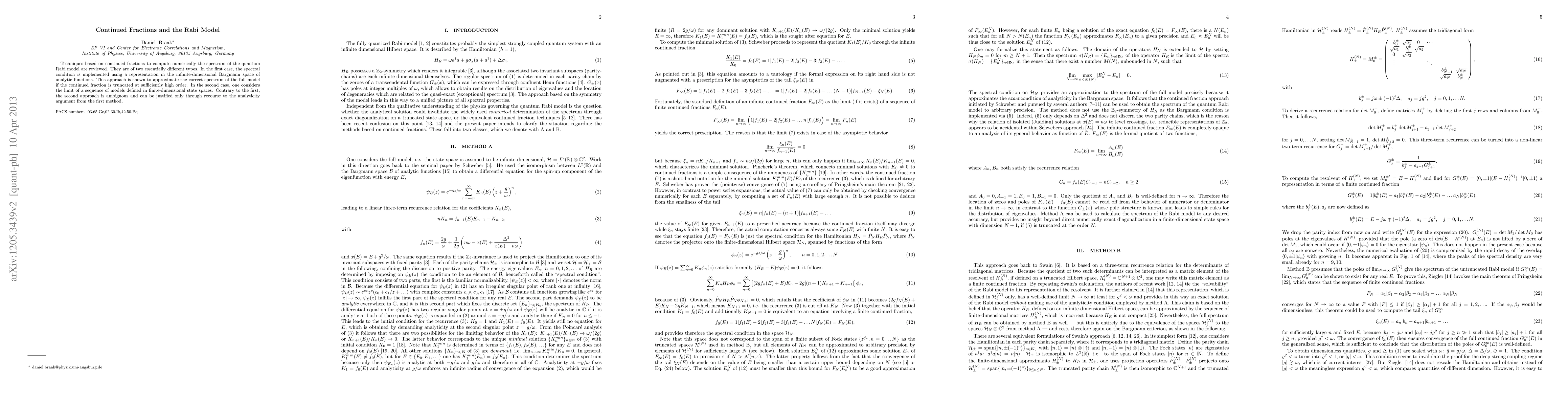 Researchers explored using continued fractions to solve the quantum Rabi model, finding that one method approximates the correct spectrum when truncated at high order, while the other approach is ambiguous and relies on an analyticity argument.
