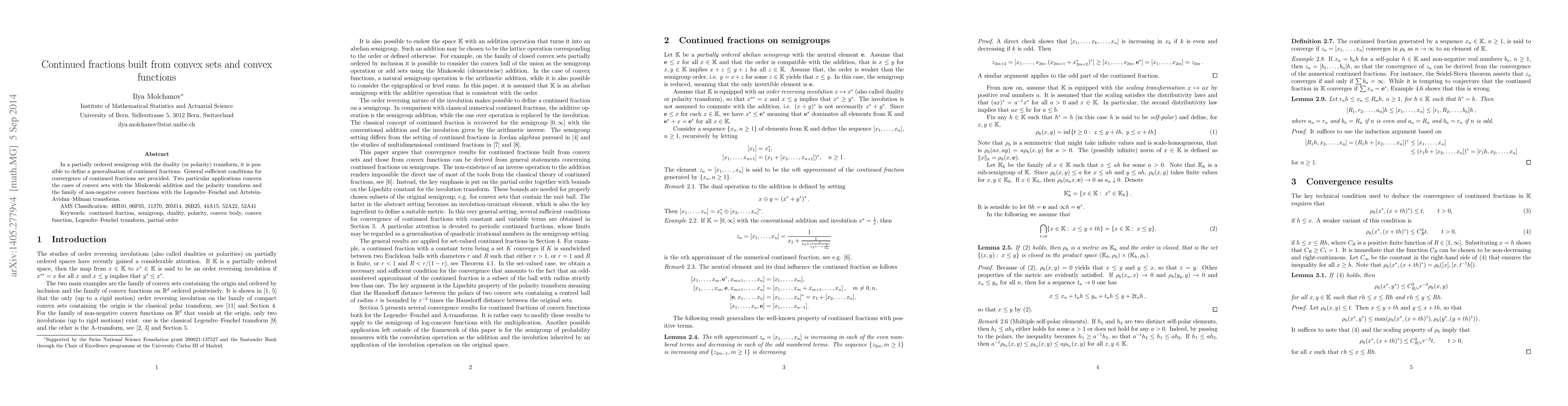 This paper generalizes continued fractions within a partially ordered semigroup, providing sufficient conditions for their convergence. It applies these results to convex sets using Minkowski addition and polarity, and to non-negative convex functions via Legendre-Fenchel and Artstein-Avidan-Milman transforms.