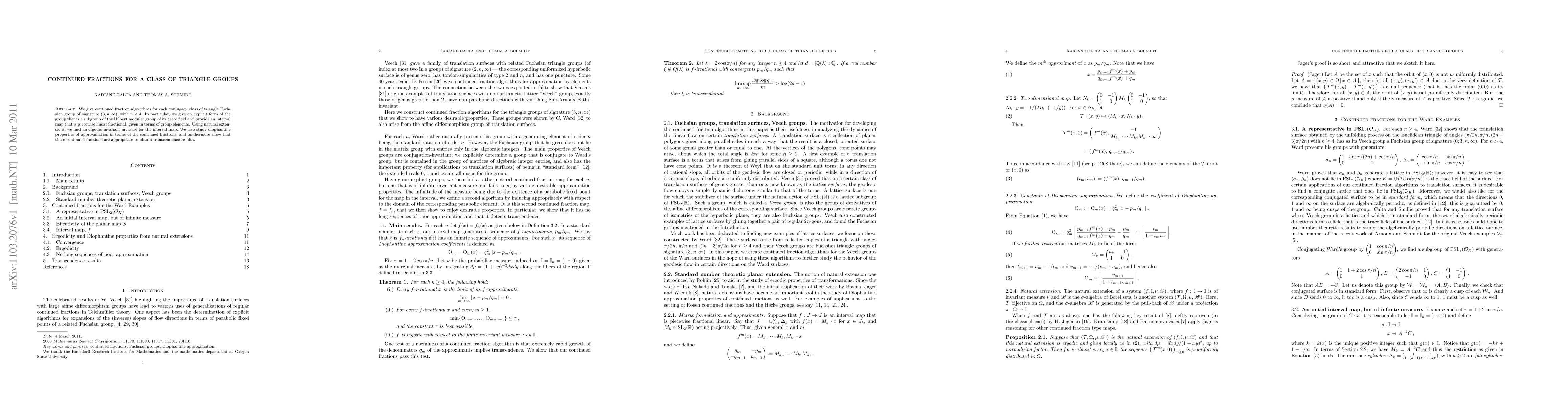 This paper presents continued fraction algorithms for a specific class of Fuchsian triangle groups, providing an explicit subgroup form within the Hilbert modular group and a piecewise linear fractional interval map. It also explores the ergodic properties and diophantine approximation of these continued fractions, demonstrating their utility in obtaining transcendence results.