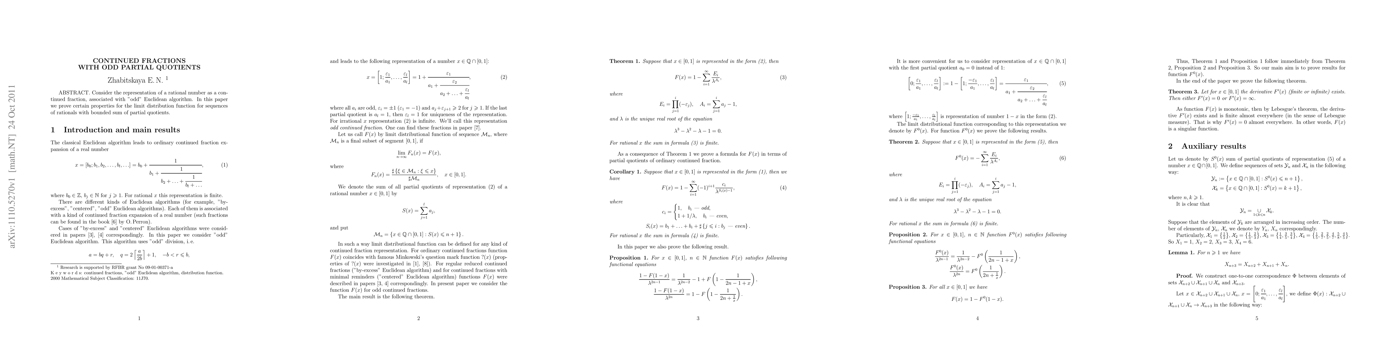 Researchers investigate properties of continued fractions with odd partial quotients, focusing on limit distribution functions and bounded sums of partial quotients.