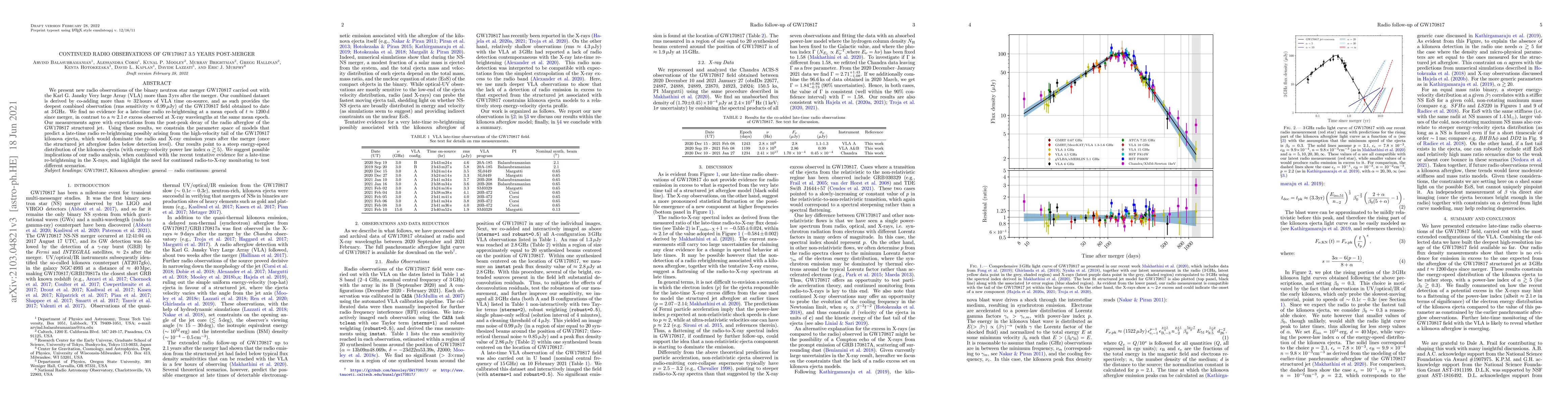 Researchers observed radio signals from GW170817 3.5 years after its merger and found no evidence of a late-time re-brightening, contradicting X-ray observations. The results suggest a steep energy-speed distribution of kilonova ejecta.