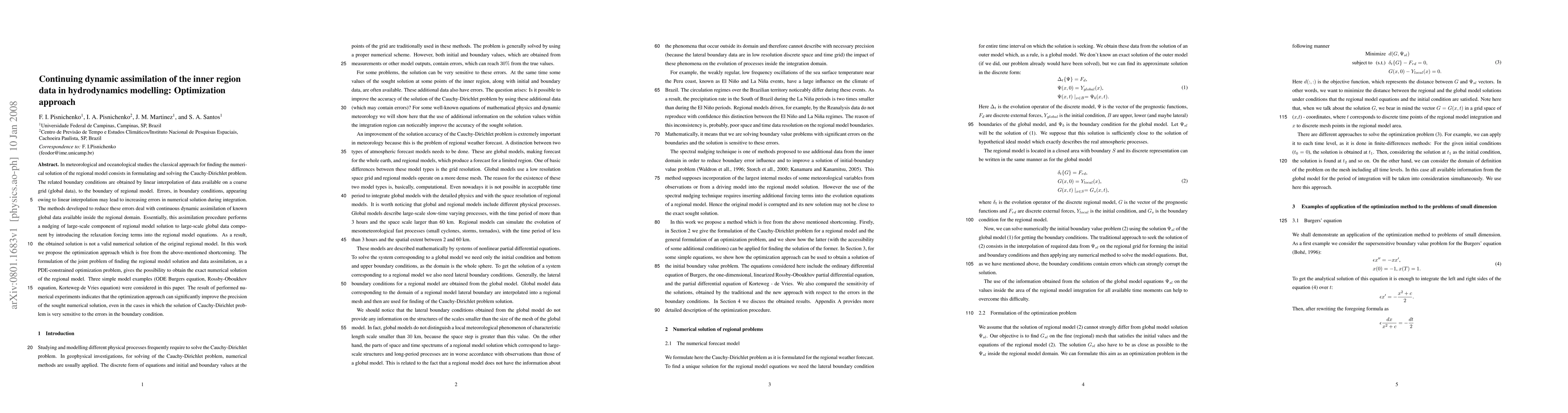 In meteorological and oceanological studies the classical approach for finding the numerical solution of the regional model consists in formulating and solving the Cauchy-Dirichlet problem. The related boundary conditions are obtained by linear interpolation of data available on a coarse grid (global data), to the boundary of regional model. Errors, in boundary conditions, appearing owing to linear interpolation may lead to increasing errors in numerical solution during integration. The methods developed to reduce these errors deal with continuous dynamic assimilation of known global data available inside the regional domain. Essentially, this assimilation procedure performs a nudging of large-scale component of regional model solution to large-scale global data component by introducing the relaxation forcing terms into the regional model equations. As a result, the obtained solution is not a valid numerical solution of the original regional model. In this work we propose the optimization approach which is free from the above-mentioned shortcoming. The formulation of the joint problem of finding the regional model solution and data assimilation, as a PDE-constrained optimization problem, gives the possibility to obtain the exact numerical solution of the regional model. Three simple model examples (ODE Burgers equation, Rossby-Oboukhov equation, Korteweg-de Vries equation) were considered in this paper. The result of performed numerical experiments indicates that the optimization approach can significantly improve the precision of the sought numerical solution, even in the cases in which the solution of Cauchy-Dirichlet problem is very sensitive to the errors in the boundary condition.