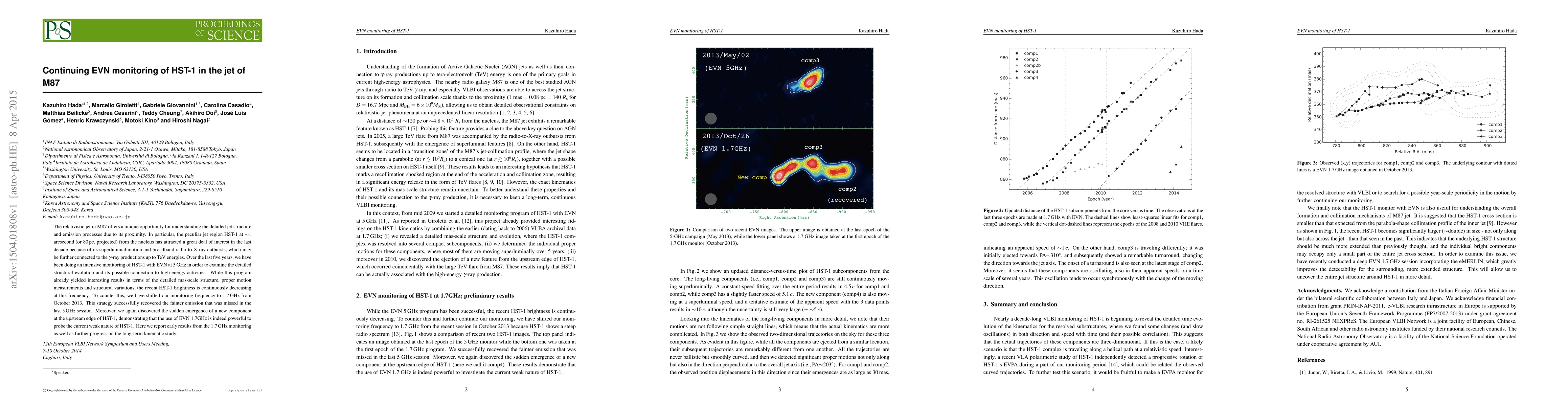 This paper reports on the continued EVN monitoring of HST-1 in the M87 jet, revealing structural evolution and a new component emergence at 1.7GHz after shifting from 5GHz due to decreasing brightness. The study highlights the effectiveness of lower frequency observations in probing the current weak state of HST-1.