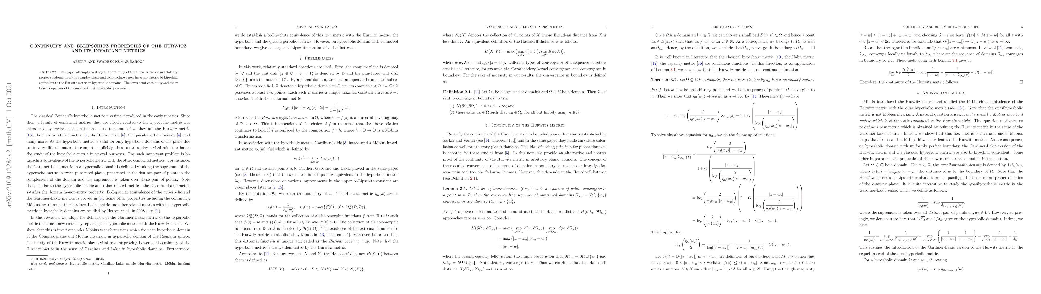 This paper explores the continuity of the Hurwitz metric in subdomains of the complex plane and introduces a new invariant metric that is bi-Lipschitz equivalent to it.