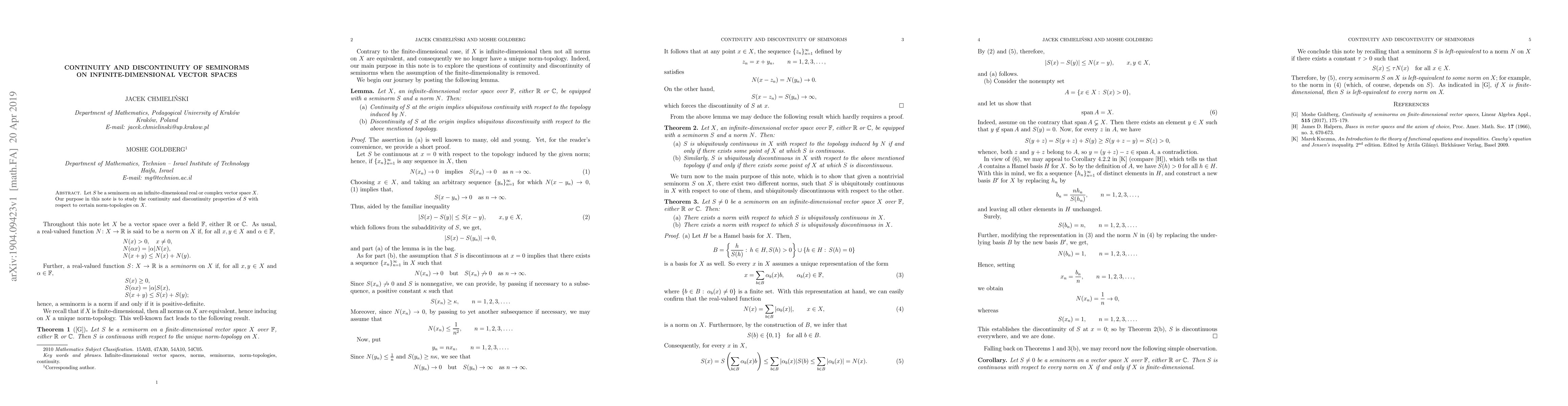 This paper investigates the continuity and discontinuity characteristics of seminorms $S$ on infinite-dimensional vector spaces $X$ under various norm-topologies, aiming to understand how these properties manifest in such complex spaces.