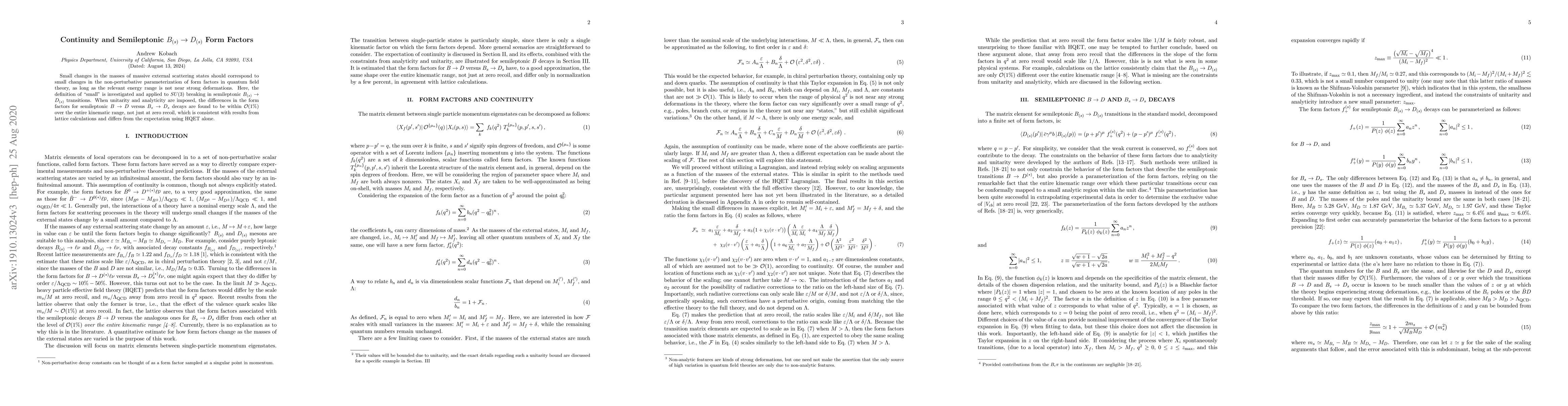 Small changes in the masses of massive external scattering states should correspond to small changes in the non-perturbative parameterization of form factors in quantum field theory, as long as the relevant energy range is not near strong deformations. Here, the definition of ``small'' is investigated and applied to $SU(3)$ breaking in semileptonic $B_{(s)}\rightarrow D_{(s)}$ transitions. When unitarity and analyticity are imposed, the differences in the form factors for semileptonic $B\rightarrow D$ versus $B_s\rightarrow D_s$ decays are found to be within $\mathcal{O}(1\%)$ over the entire kinematic range, not just at zero recoil, which is consistent with results from lattice calculations and differs from the expectation using HQET alone.