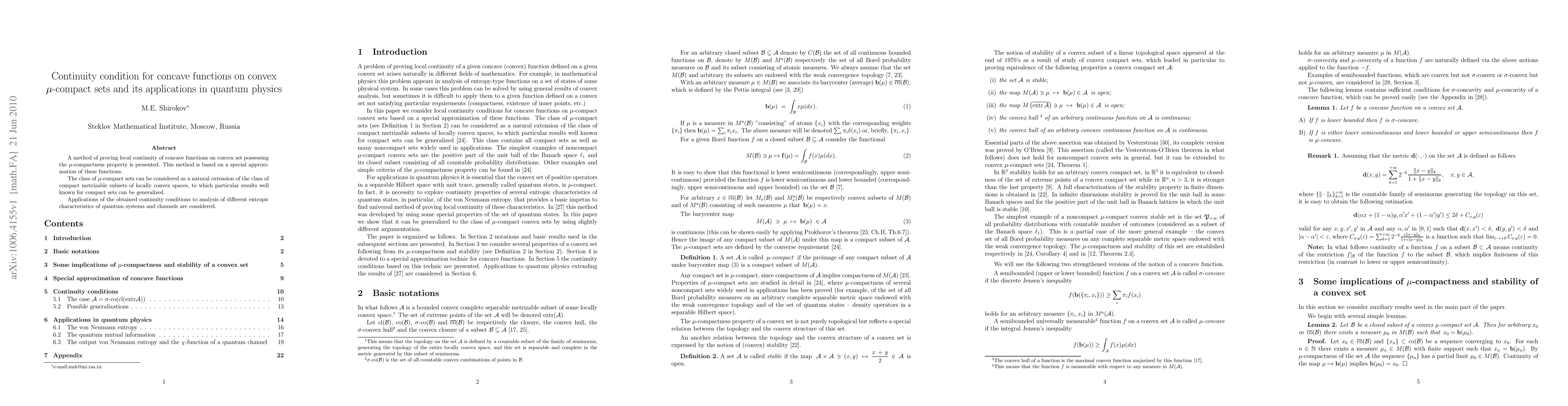 A method of proving local continuity of concave functions on convex set possessing the $\mu$-compactness property is presented. This method is based on a special approximation of these functions. The class of $\mu$-compact sets can be considered as a natural extension of the class of compact metrizable subsets of locally convex spaces, to which particular results well known for compact sets can be generalized. Applications of the obtained continuity conditions to analysis of different entropic characteristics of quantum systems and channels are considered.