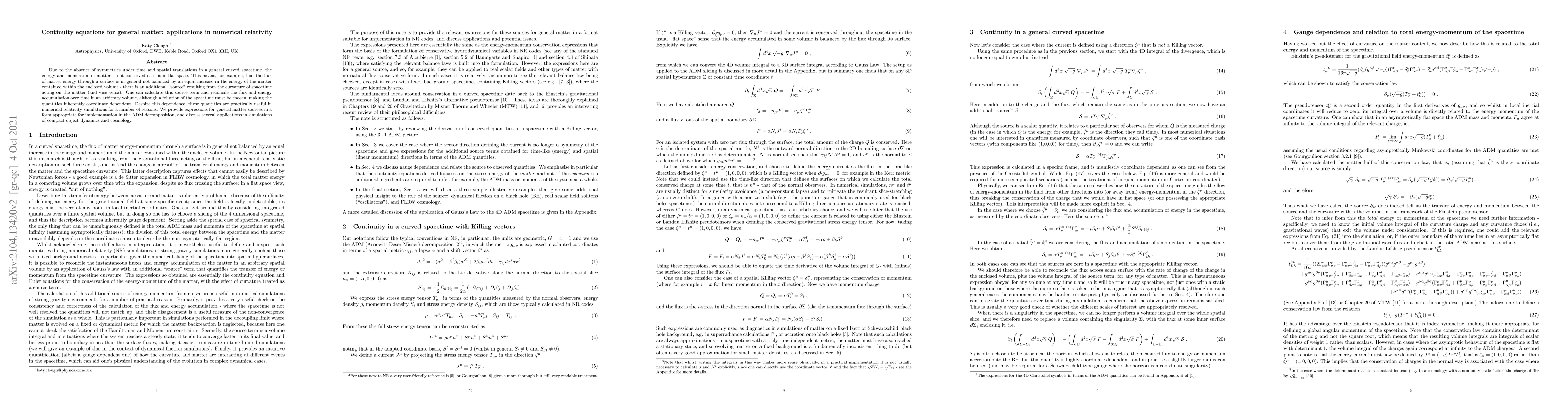 This paper presents expressions for matter source terms in curved spacetimes, crucial for numerical relativity simulations. Despite coordinate dependence arising from choosing a foliation of spacetime, these quantities are practically useful for modeling compact object dynamics and cosmology.