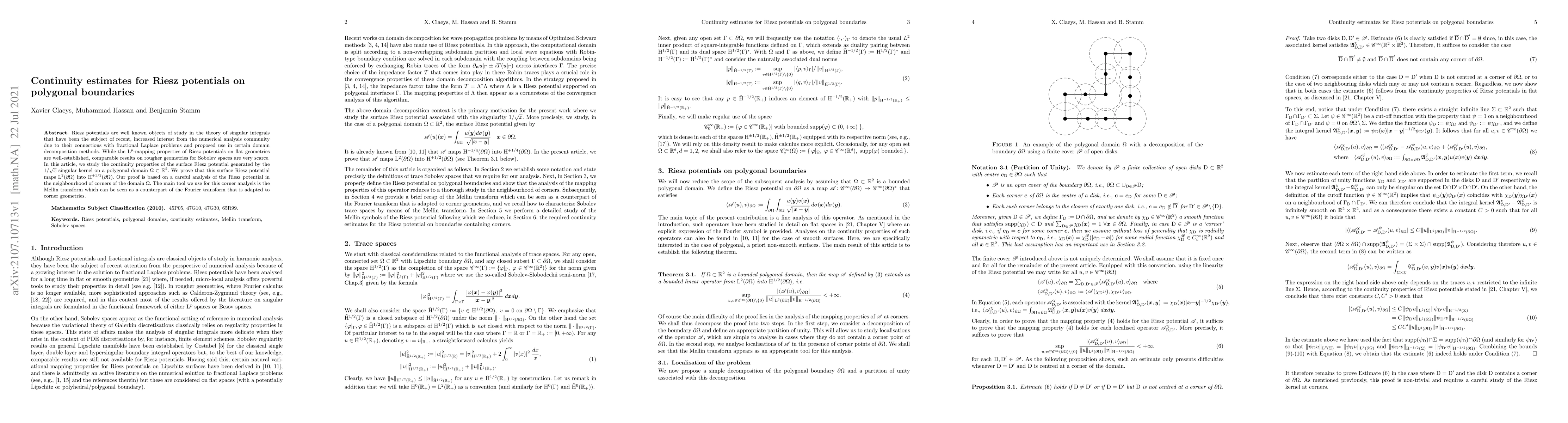 This paper investigates the continuity properties of the surface Riesz potential on polygonal boundaries, proving that it maps L²(∂Ω) into H¹/₂(∂Ω). The study employs the Mellin transform for analyzing the potential near corners, providing a novel approach adapted to rough geometries.