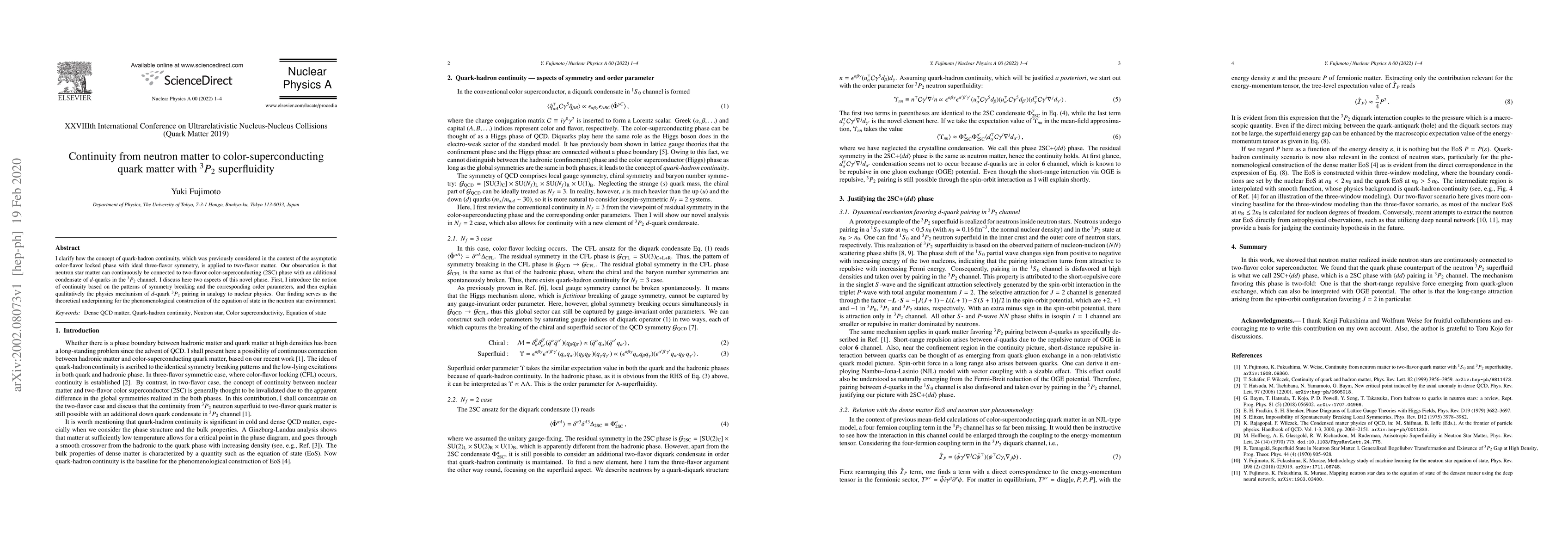 I clarify how the concept of quark-hadron continuity, which was previously considered in the context of the asymptotic color-flavor locked phase with ideal three-flavor symmetry, is applied to two-flavor matter. Our observation is that neutron star matter can continuously be connected to two-flavor color-superconducting (2SC) phase with an additional condensate of $d$-quarks in the $^3P_2$ channel. I discuss here two aspects of this novel phase. First, I introduce the notion of continuity based on the patterns of symmetry breaking and the corresponding order parameters, and then explain qualitatively the physics mechanism of $d$-quark $^3P_2$ pairing in analogy to nuclear physics. Our finding serves as the theoretical underpinning for the phenomenological construction of the equation of state in the neutron star environment.