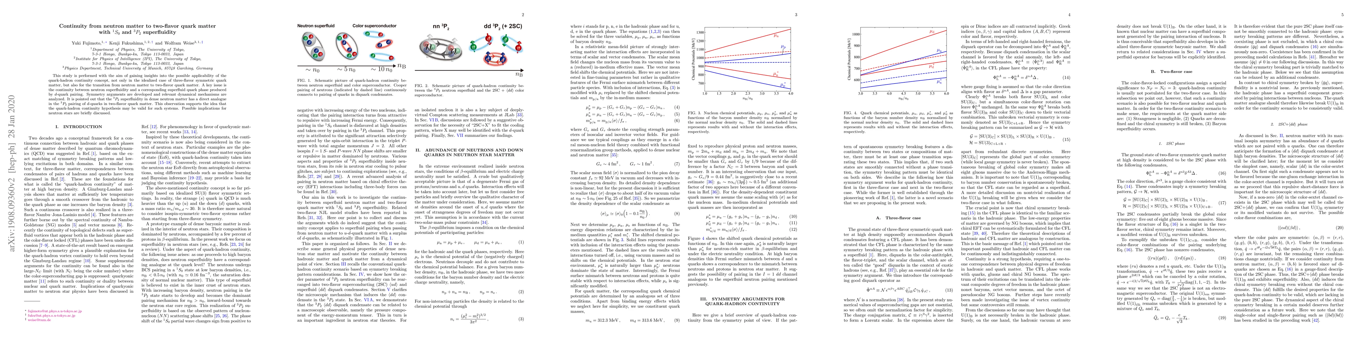 This study is performed with the aim of gaining insights into the possible applicability of the quark-hadron continuity concept, not only in the idealized case of three-flavor symmetric quark matter, but also for the transition from neutron matter to two-flavor quark matter. A key issue is the continuity between neutron superfluidity and a corresponding superfluid quark phase produced by $d$-quark pairing. Symmetry arguments are developed and relevant dynamical mechanisms are analyzed. It is pointed out that the $^3P_2$ superfluidity in dense neutron matter has a direct analogue in the $^3P_2$ pairing of $d$-quarks in two-flavor quark matter. This observation supports the idea that the quark-hadron continuity hypothesis may be valid for such systems. Possible implications for neutron stars are briefly discussed.