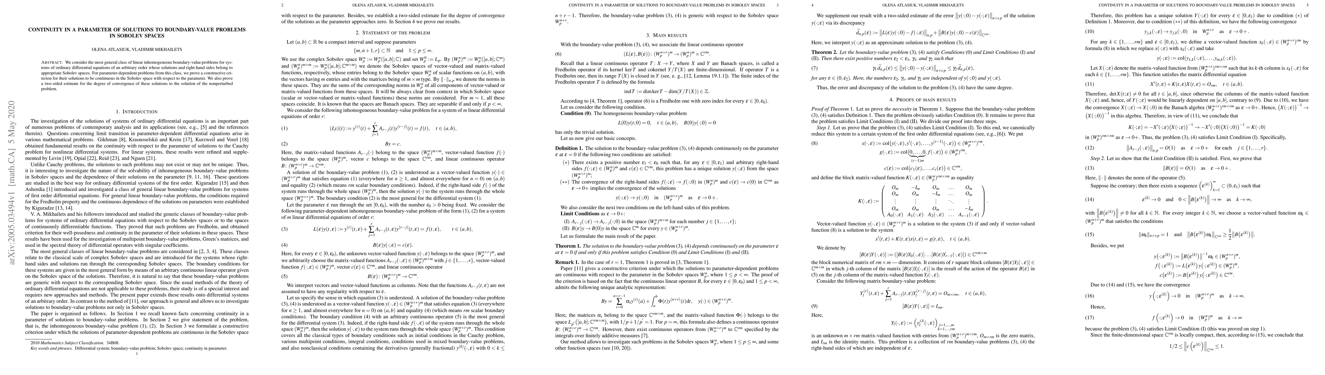 This paper establishes a criterion for the continuity of solutions to parameter-dependent boundary-value problems in Sobolev spaces, and provides a two-sided estimate for the convergence rate of these solutions to the nonperturbed problem.