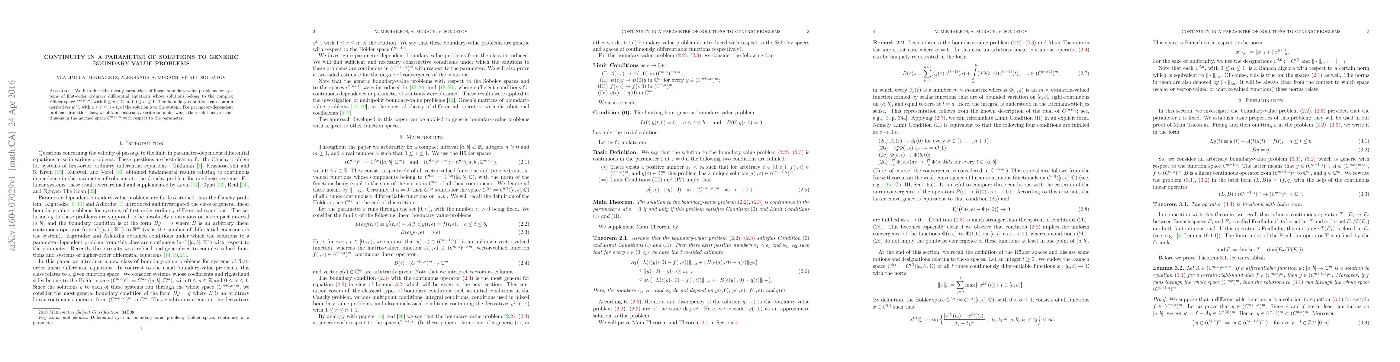 We introduce the most general class of linear boundary-value problems for systems of first-order ordinary differential equations whose solutions belong to the complex H\"older space $C^{n+1,\alpha}$, with $0\leq n\in\mathbb{Z}$ and $0\leq\alpha\leq1$. The boundary conditions can contain derivatives $y^{(r)}$, with $1\leq r\leq n+1$, of the solution $y$ to the system. For parameter-dependent problems from this class, we obtain constructive criterion under which their solutions are continuous in the normed space $C^{n+1,\alpha}$ with respect to the parameter.