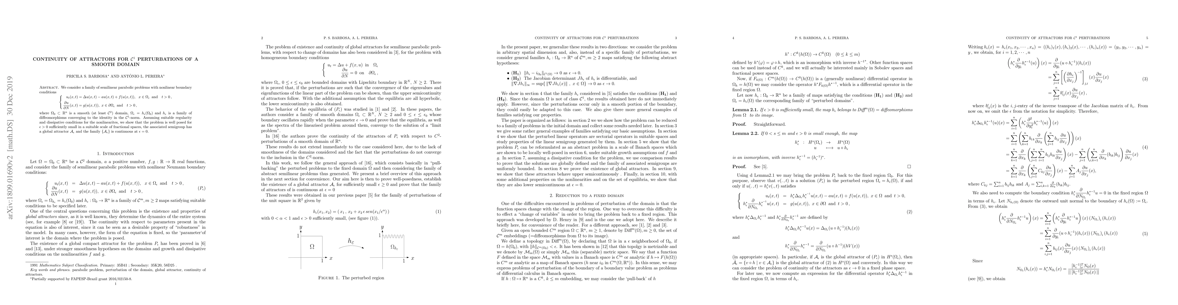 We consider a family of semilinear parabolic problems with nonlinear boundary conditions \[ \left\{ \begin{aligned} u_t(x,t) &=\Delta u(x,t) -au(x,t) + f(u(x,t)),\ x \in \Omega_\epsilon \mbox{ and } t>0\,,\\ \displaystyle\frac{\partial u}{\partial N}(x,t) &=g(u(x,t)),\ x \in \partial\Omega_\epsilon \mbox{ and } t>0\,, \end{aligned} \right. \] where $\Omega_0 \subset \mathbb{R}^n$ is a smooth (at least $\mathcal{C}^2$) domain , $\Omega_{\epsilon} = h_{\epsilon}(\Omega_0)$ and $h_{\epsilon}$ is a family of diffeomorphisms converging to the identity in the $\mathcal{C}^1$-norm. Assuming suitable regularity and dissipative conditions for the nonlinearites, we show that the problem is well posed for $\epsilon>0$ sufficiently small in a suitable scale of fractional spaces, the associated semigroup has a global attractor $\mathcal{A}_{\epsilon}$ and the family $\{\mathcal{A}_{\epsilon}\}$ is continuous at $\epsilon = 0$.