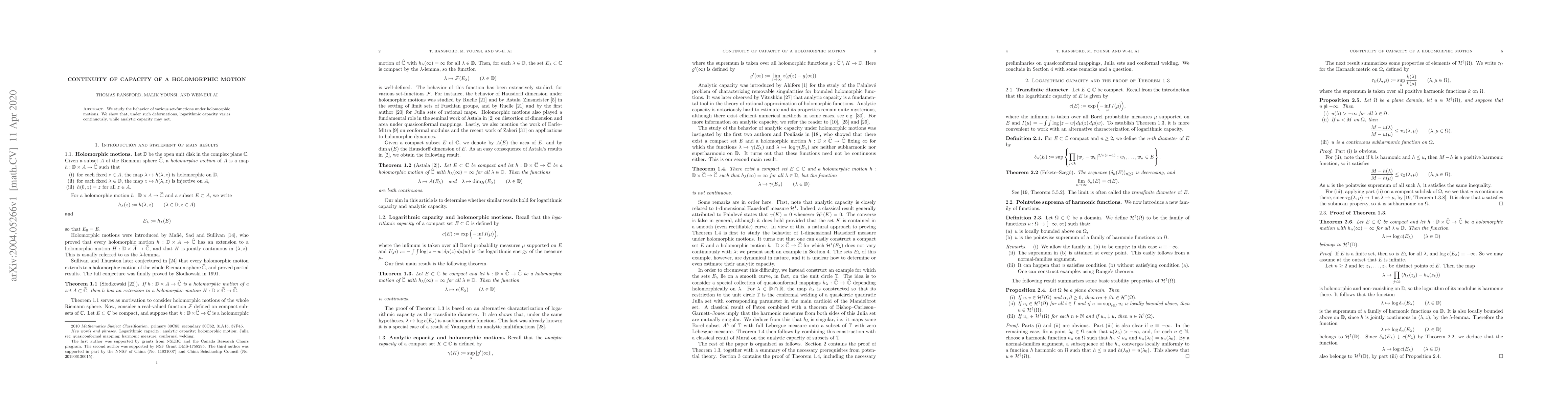 This paper investigates how set-functions behave under holomorphic motions, finding that logarithmic capacity is continuous but analytic capacity may not be.