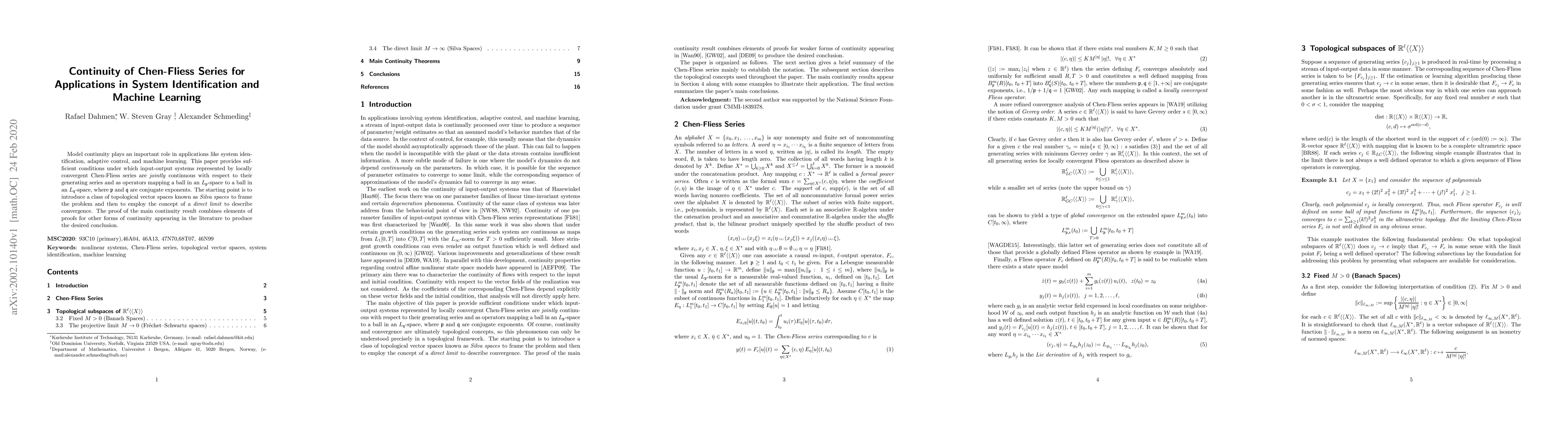 This paper establishes conditions for continuity of Chen-Fliess series in system identification and machine learning, providing sufficient conditions for input-output systems to be jointly continuous with respect to their generating series.