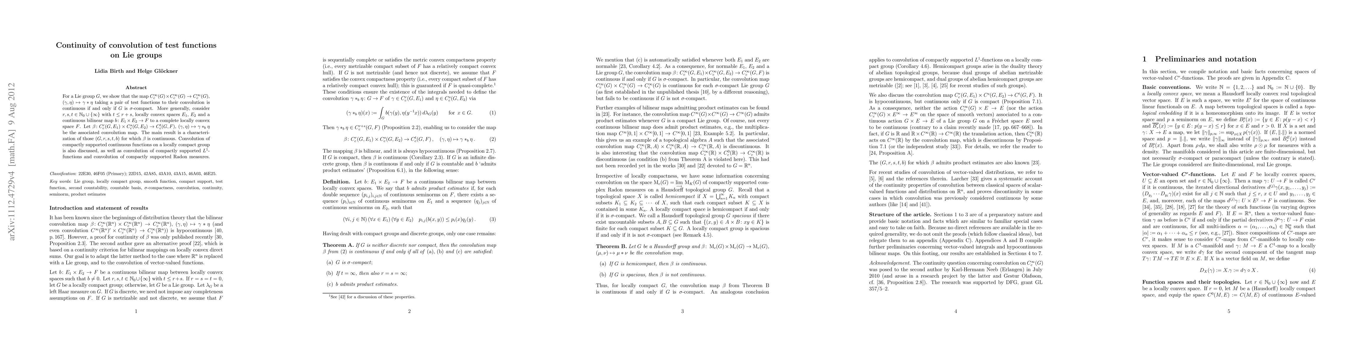 If G is a Lie group, let D(G) be the space of compactly supported smooth functions on G. Consider the bilinear map B : D(G) x D(G) -> D(G), (f,g) |-> f*g which takes a pair of test functions to their convolution. We show that B is continuous if and only if G is sigma-compact. More generally, let r,s,t be non-negative integers (or infinity) with t <= r+s. Let E_1, E_2 be locally convex spaces and b : E_1 x E_2 -> F be a continuous bilinear map to a complete locally convex space F. The main result is a characterization of those (G,r,s,t,b) for which the convolution map C^r_c(G,E_1) x C^s_c(G,E_2) -> C^t_c(G,F) associated with b is continuous. Convolution of compactly supported continuous functions on a locally compact group is also discussed, as well as convolution of compactly supported L^1-functions and convolution of compactly supported Radon measures.